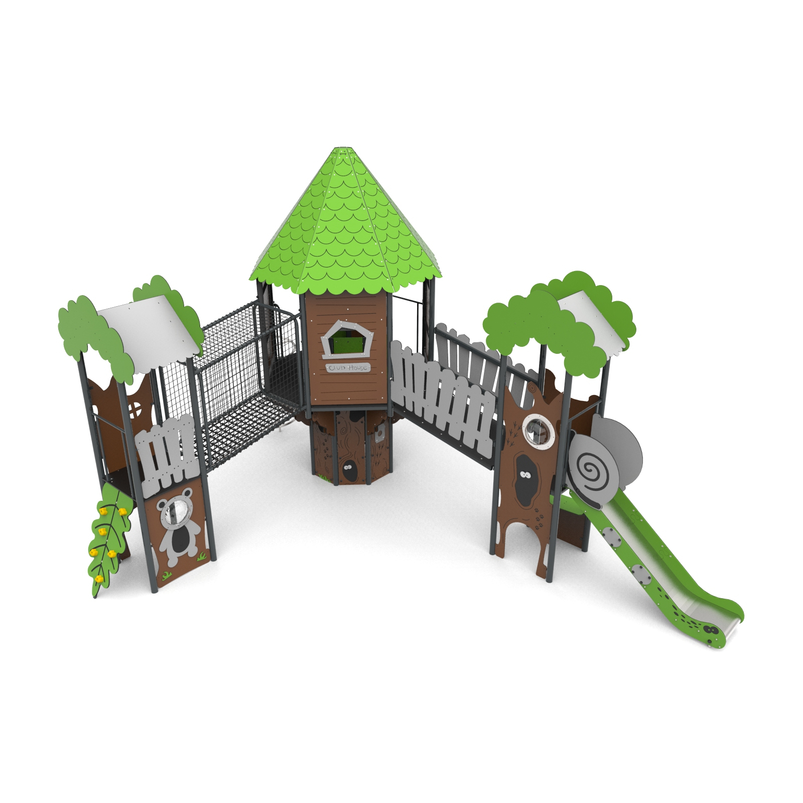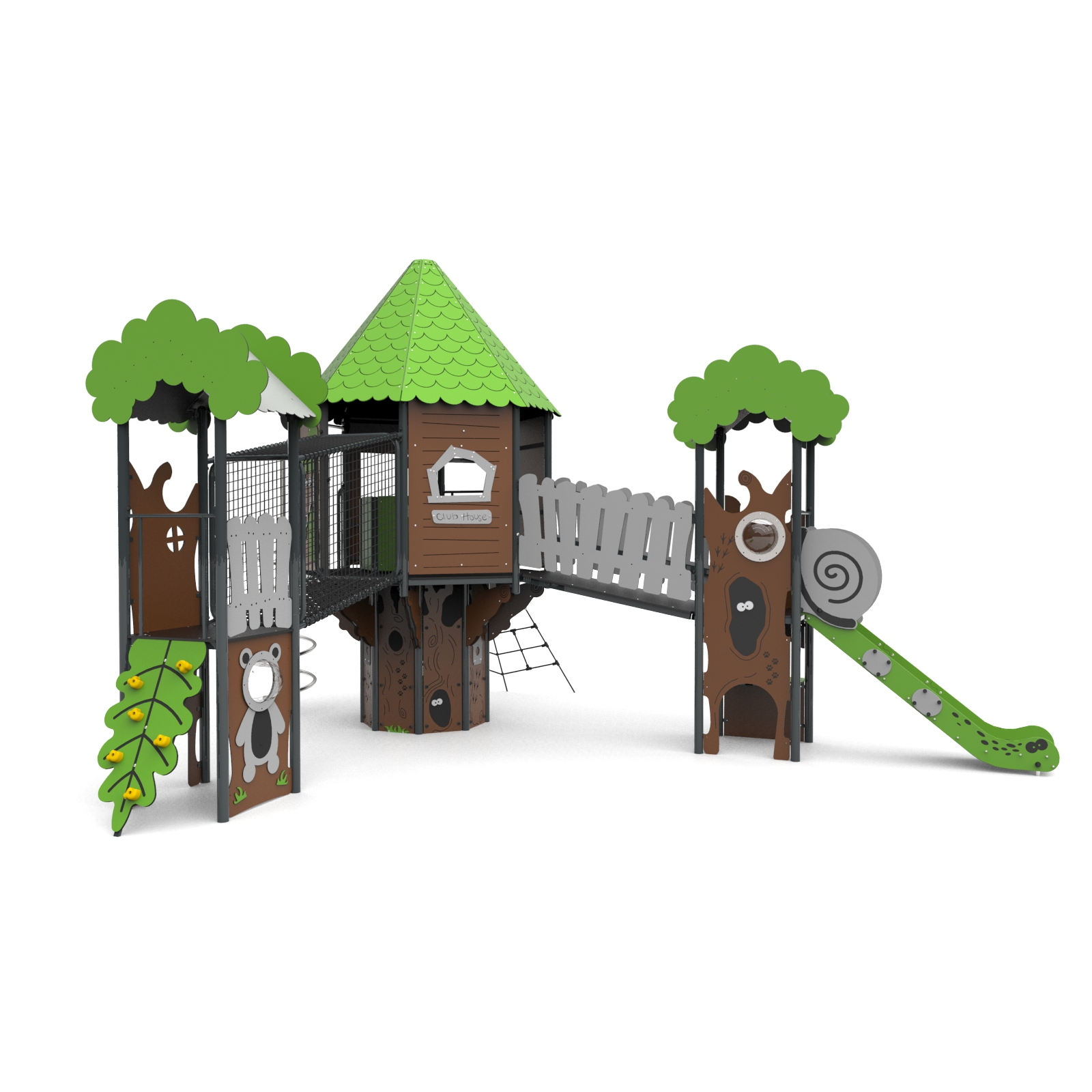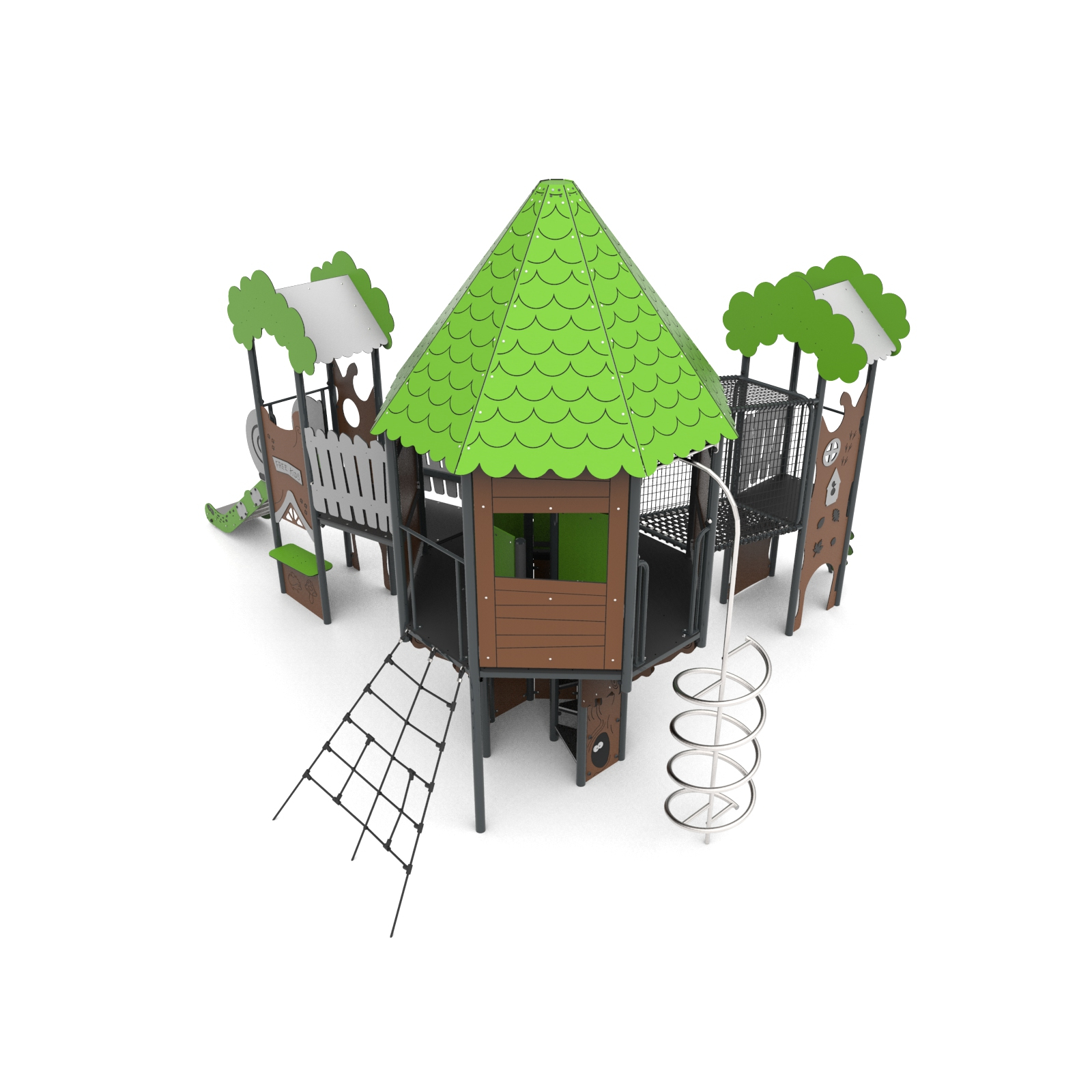 Geräte, die mit einem Haus mit einer Behandlungstreppe leicht zugänglich sind, deren obere Plattform über die Basis hinausragt. Das Haus befindet sich auf einem achteckigen Grundriss mit einem achteckigen Dach. Das Ganze ist dicht mit Anwendungen zum Thema Wald bedeckt. Die Plattformen bestehen aus rutschfesten Platten, die von geschweißten Stahlrahmen getragen werden. Geländer aus 15 mm starken HDPE-Platten mit gefrästen verstärkten Stahlrahmen oben und unten.