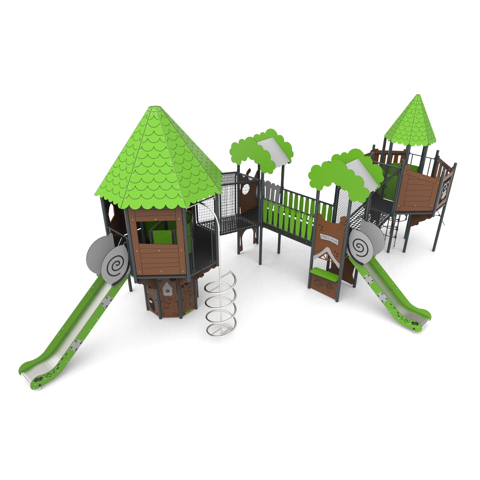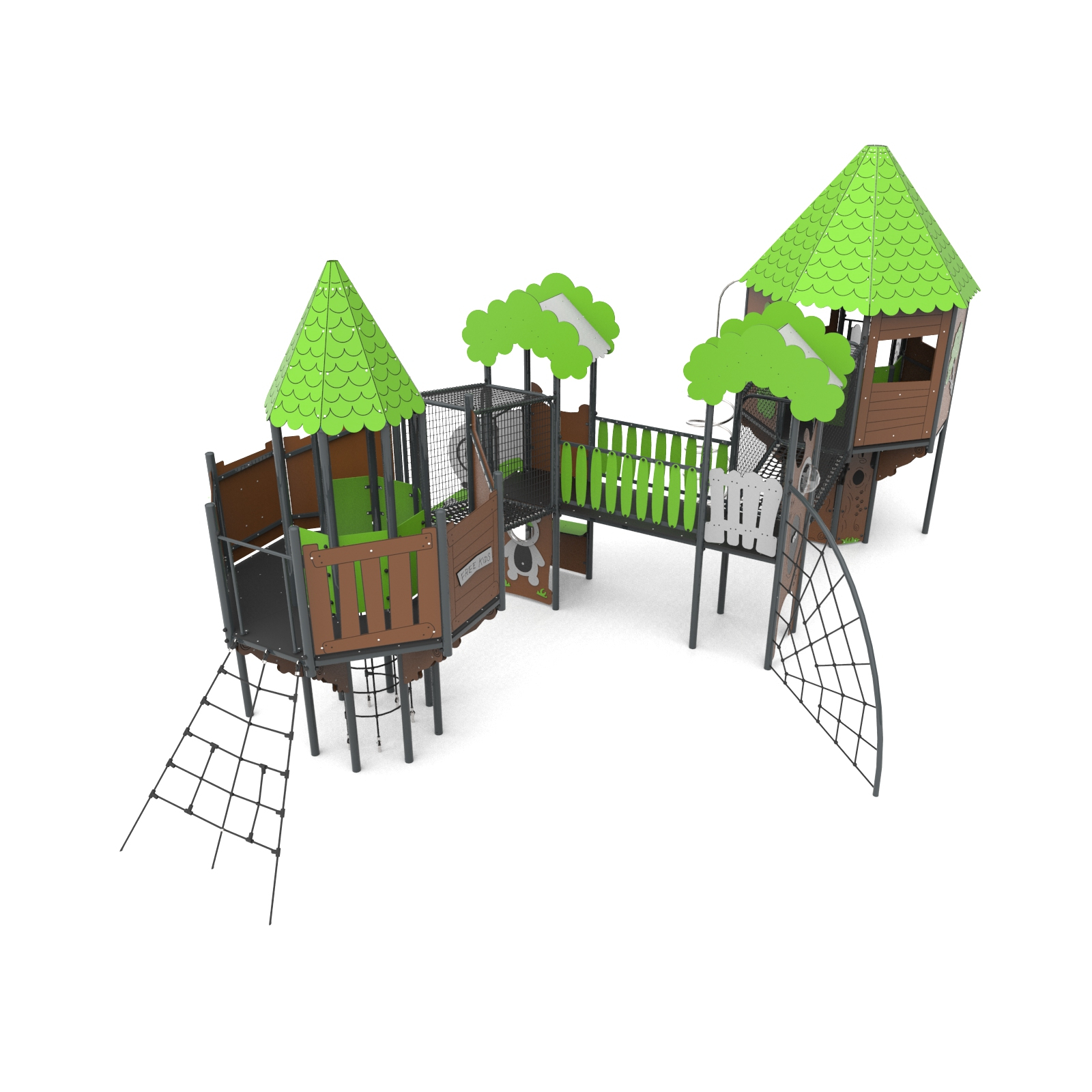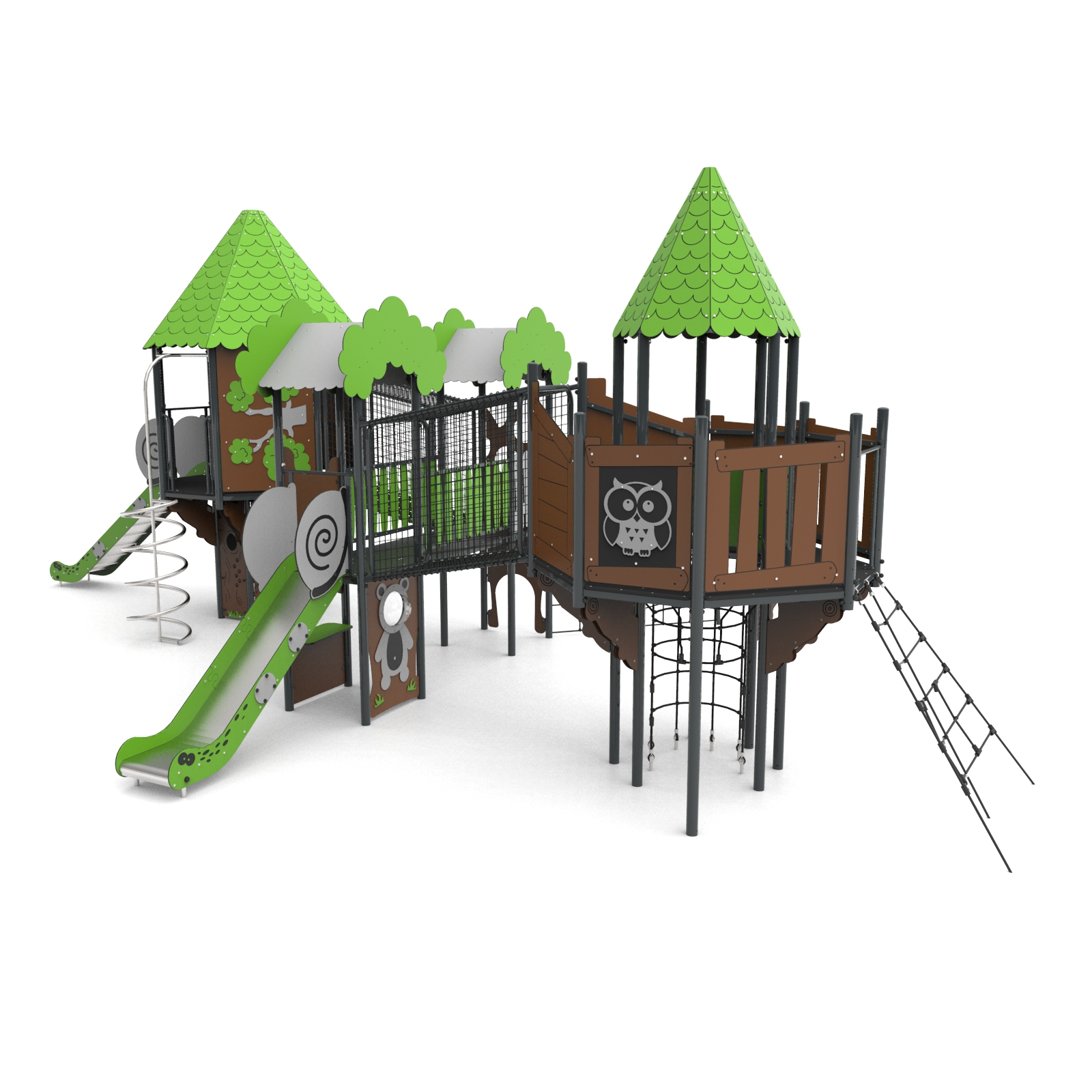 Geräte, die mit einem Haus mit einer Behandlungstreppe leicht zugänglich sind, deren obere Plattform über die Basis hinausragt. Das Haus befindet sich auf einem achteckigen Grundriss mit einem achteckigen Dach. Das Ganze ist dicht mit Anwendungen zum Thema Wald bedeckt. Die Plattformen bestehen aus rutschfesten Platten, die von geschweißten Stahlrahmen getragen werden. Geländer aus 15 mm starken HDPE-Platten mit gefrästen verstärkten Stahlrahmen oben und unten.