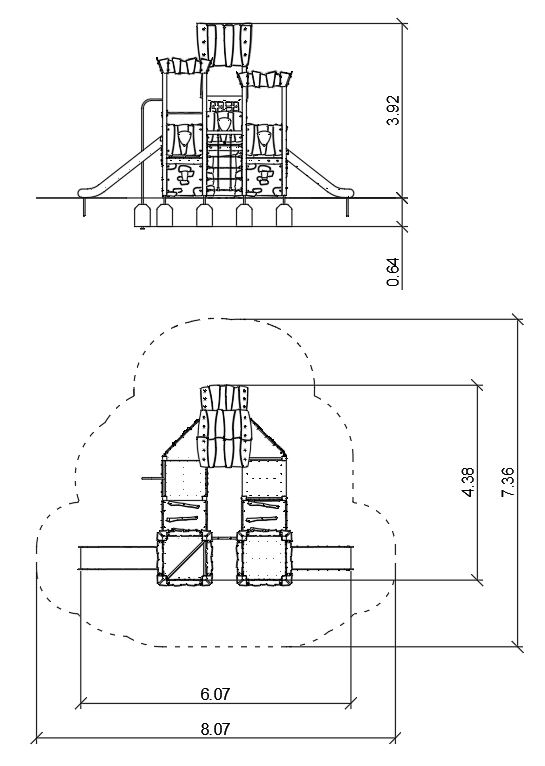 The device is based on wooden poles with a square cross-section. The spaces under the platforms are built up at the entire height with slabs, creating nooks and crannies and tunnels. Gable roofs made of HPL and HDPE. Slabs milled into patterns resembling planks and stone walls. Platforms covered with an anti-slip coating. On the towers there are bay windows with a single-seatron roof and windows, with benches inside.