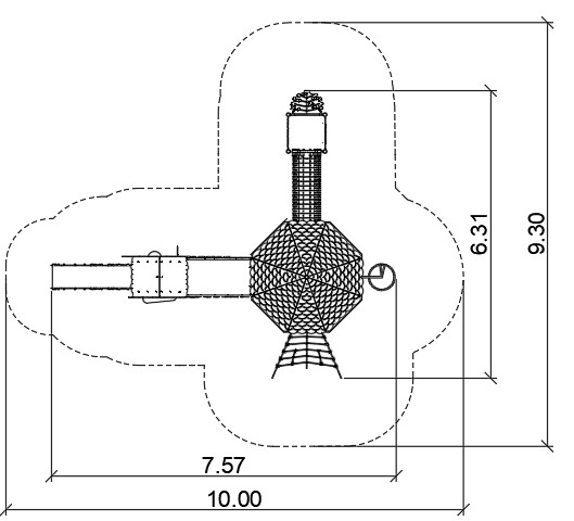 Devices easily accessible with a house with a treatment staircase, the upper platform of which protrudes above the base. The house is on an octagonal plan with an octagonal roof. The whole is densely covered with forest-themed applications. The platforms are made of anti-slip plates supported by welded steel frames. Railings made of 15 mm thick HDPE boards with milling reinforced steel frames at the top and bottom.