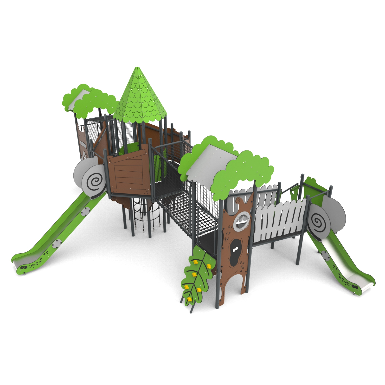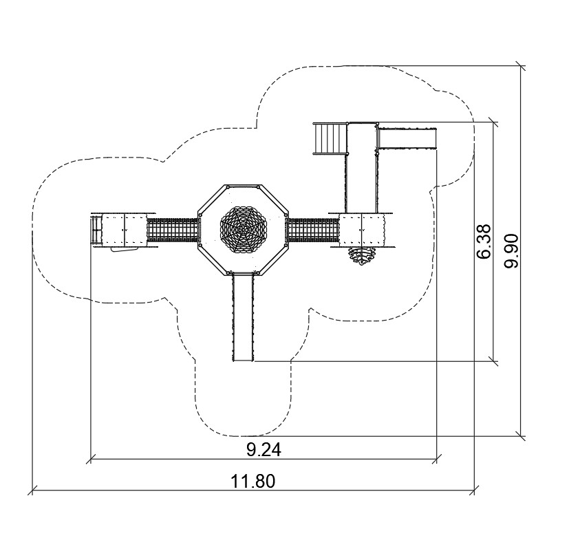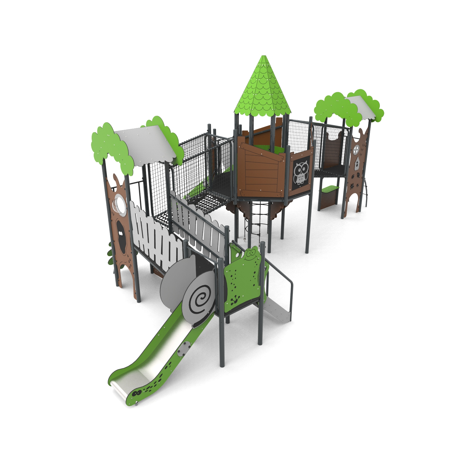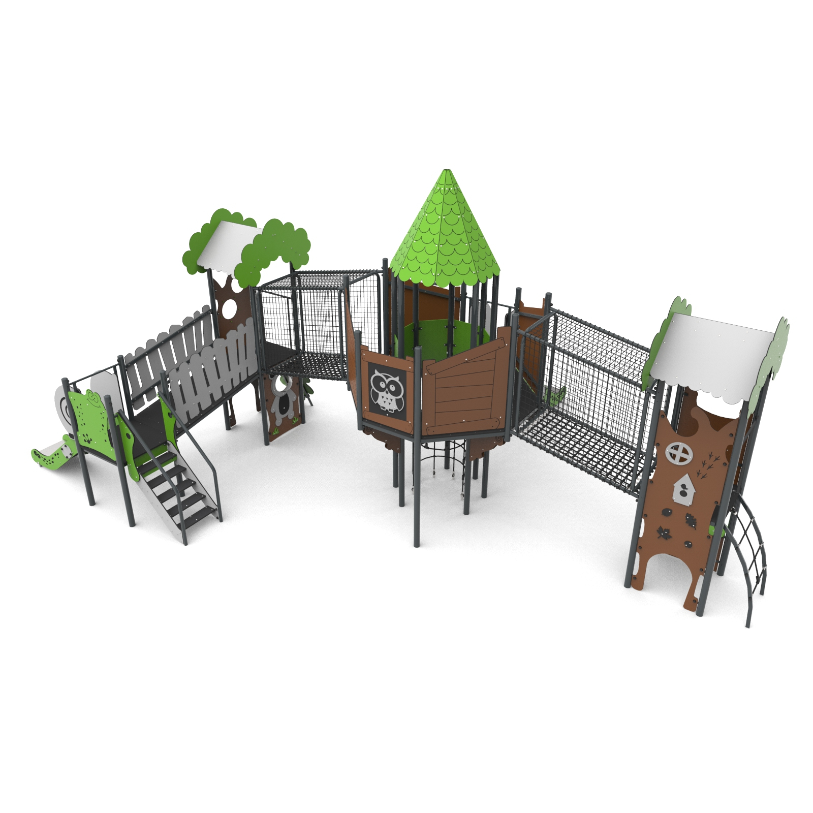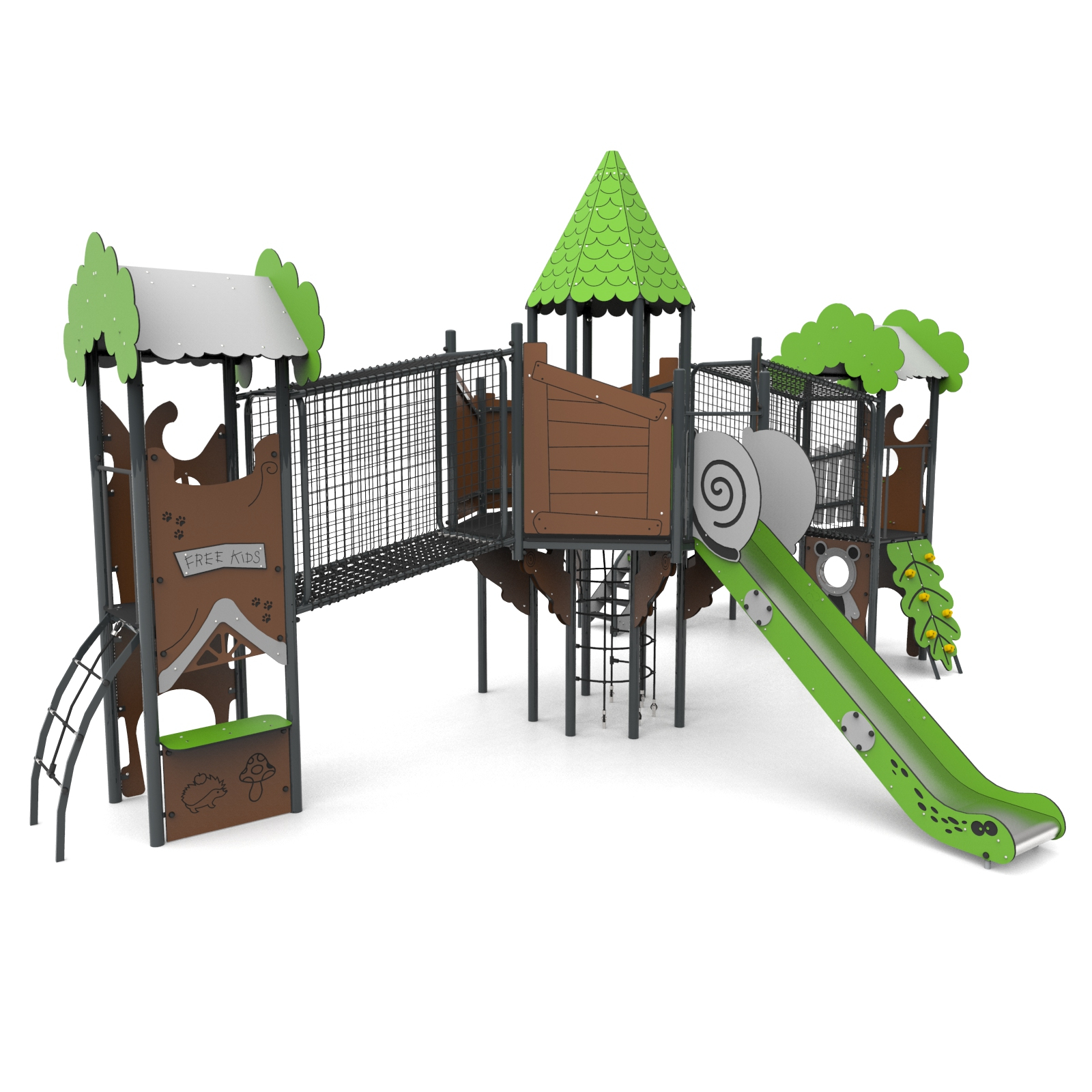 Devices easily accessible with a house with a treatment staircase, the upper platform of which protrudes above the base. The house is on an octagonal plan with an octagonal roof. The whole is densely covered with forest-themed applications. The platforms are made of anti-slip plates supported by welded steel frames. Railings made of 15 mm thick HDPE boards with milling reinforced steel frames at the top and bottom.