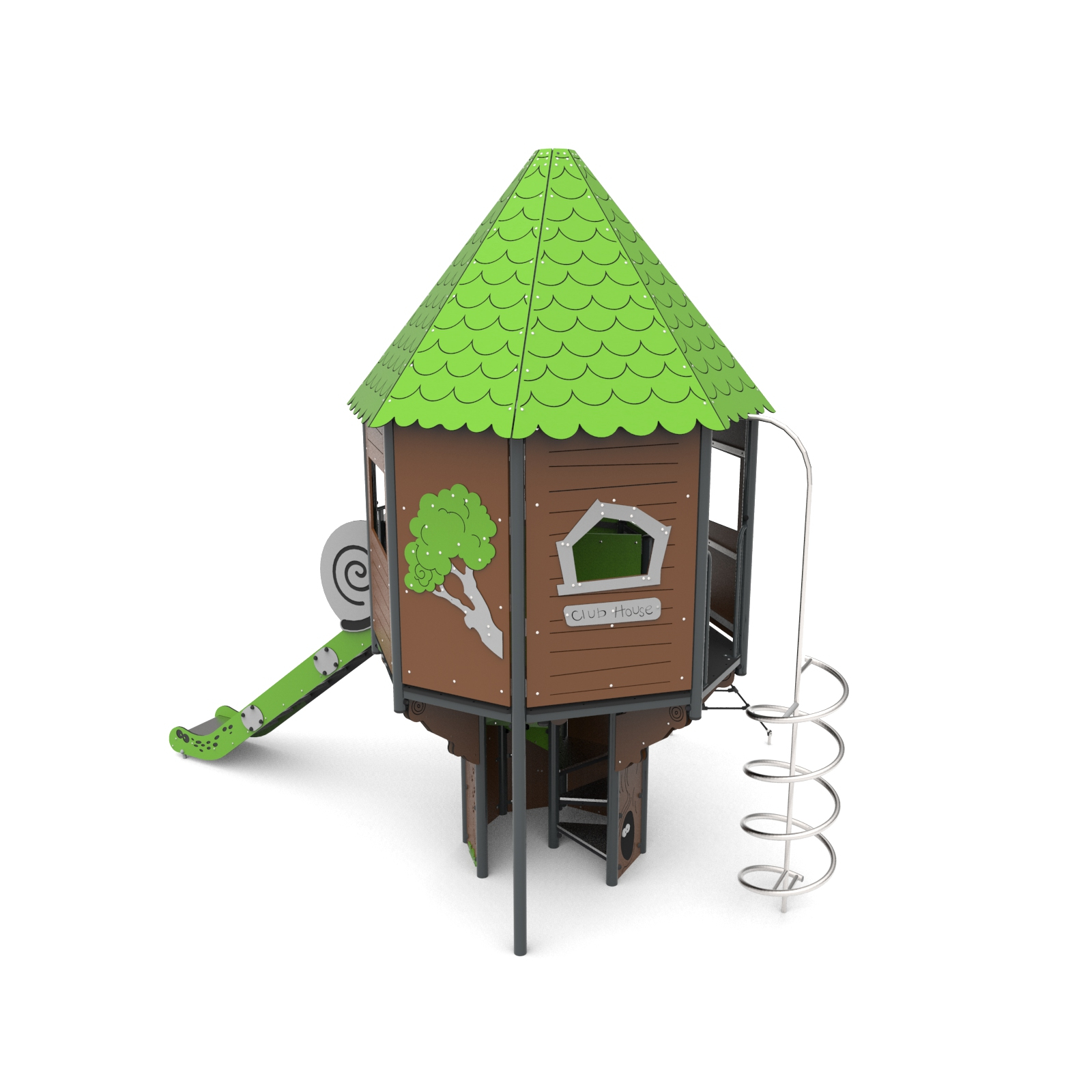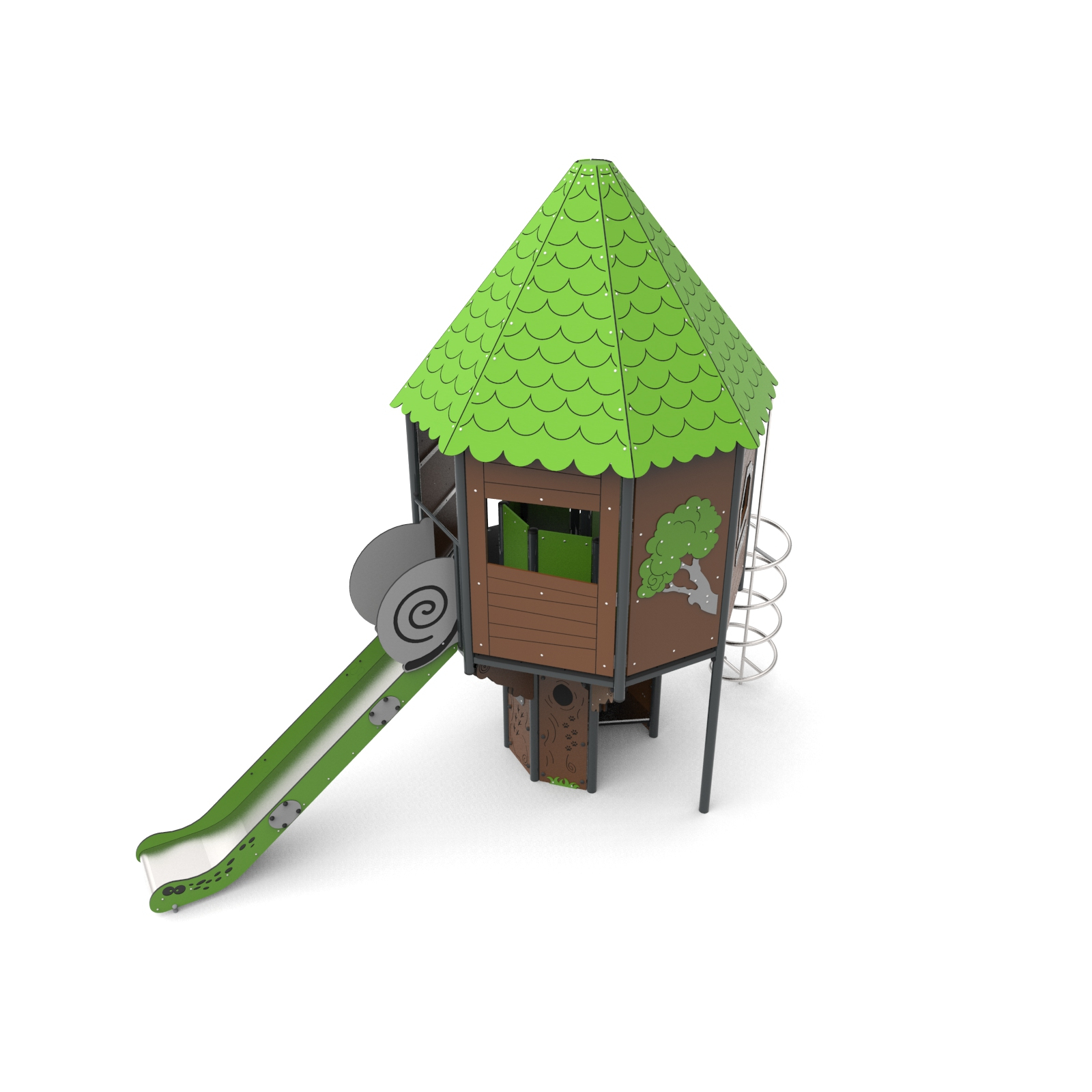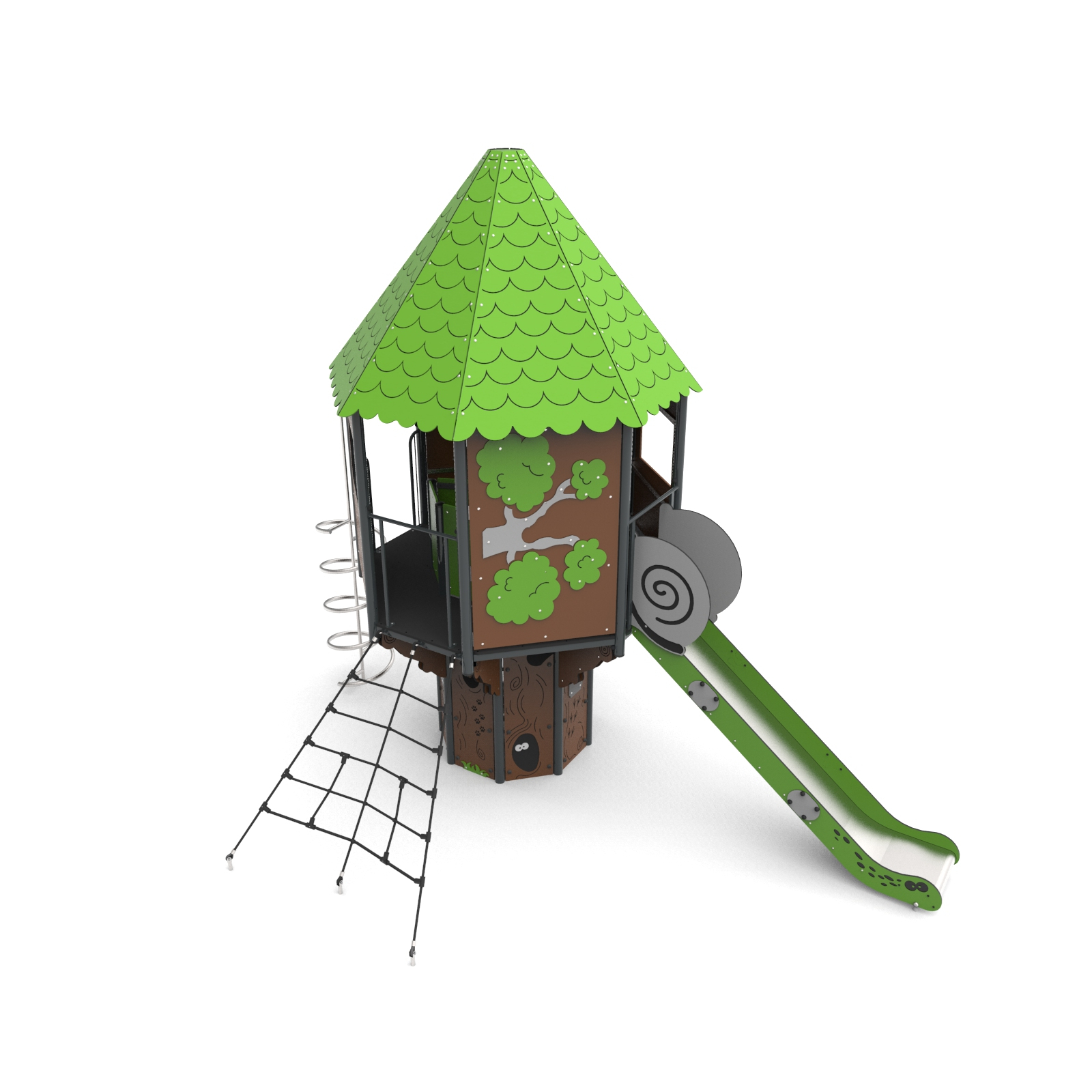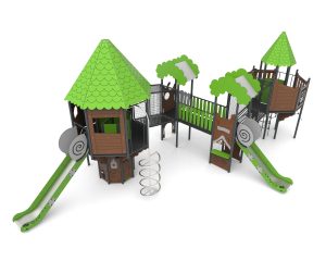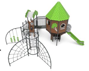 Devices easily accessible with a house with a treatment staircase, the upper platform of which protrudes above the base. The house is on an octagonal plan with an octagonal roof. The whole is densely covered with forest-themed applications. The platforms are made of anti-slip plates supported by welded steel frames. Railings made of 15 mm thick HDPE boards with milling reinforced steel frames at the top and bottom.