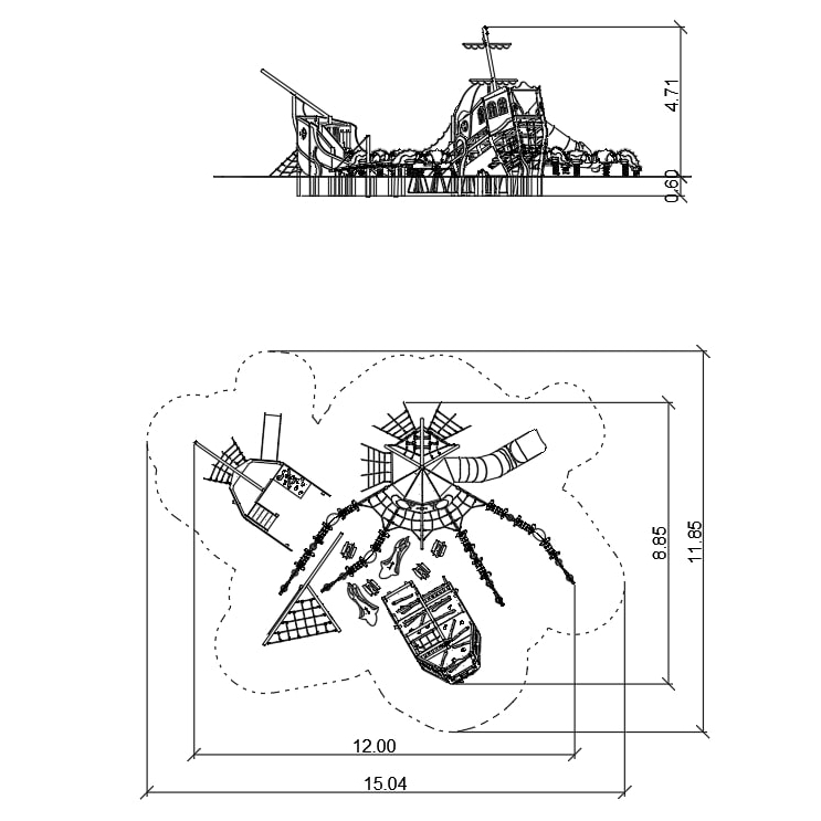 Dispositif composé d’un Kraken et d’un navire en train de couler. Dispositif en forme de Kraken construit sur un plan circulaire avec 4 paires de tentacules. Les tentacules sont constituées de segments montés sur ressorts et reliés entre eux par des cordes. La tête du kraken est équipée d’un toboggan tubulaire en acier inoxydable, de plates-formes, de filets et de cordes spatiales. Dispositif en forme de navire coulé, composé d’une partie avant facilement accessible, d’une partie arrière difficile d’accès, de plates-formes sur ressorts en forme de requin et de débris de navire, ainsi que d’un filet imitant un mât renversé. La partie avant est équipée d’un escalier, d’un mur d’escalade incliné, d’un toboggan et d’un filet. La partie arrière est entièrement construite à un angle de 20 degrés. Toutes les passerelles et les poteaux doivent être construits à un angle imitant un navire en train de couler. De plus, l’équipement doit comprendre de nombreux filets en corde, une roue à gouverner et des canons mobiles.
