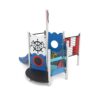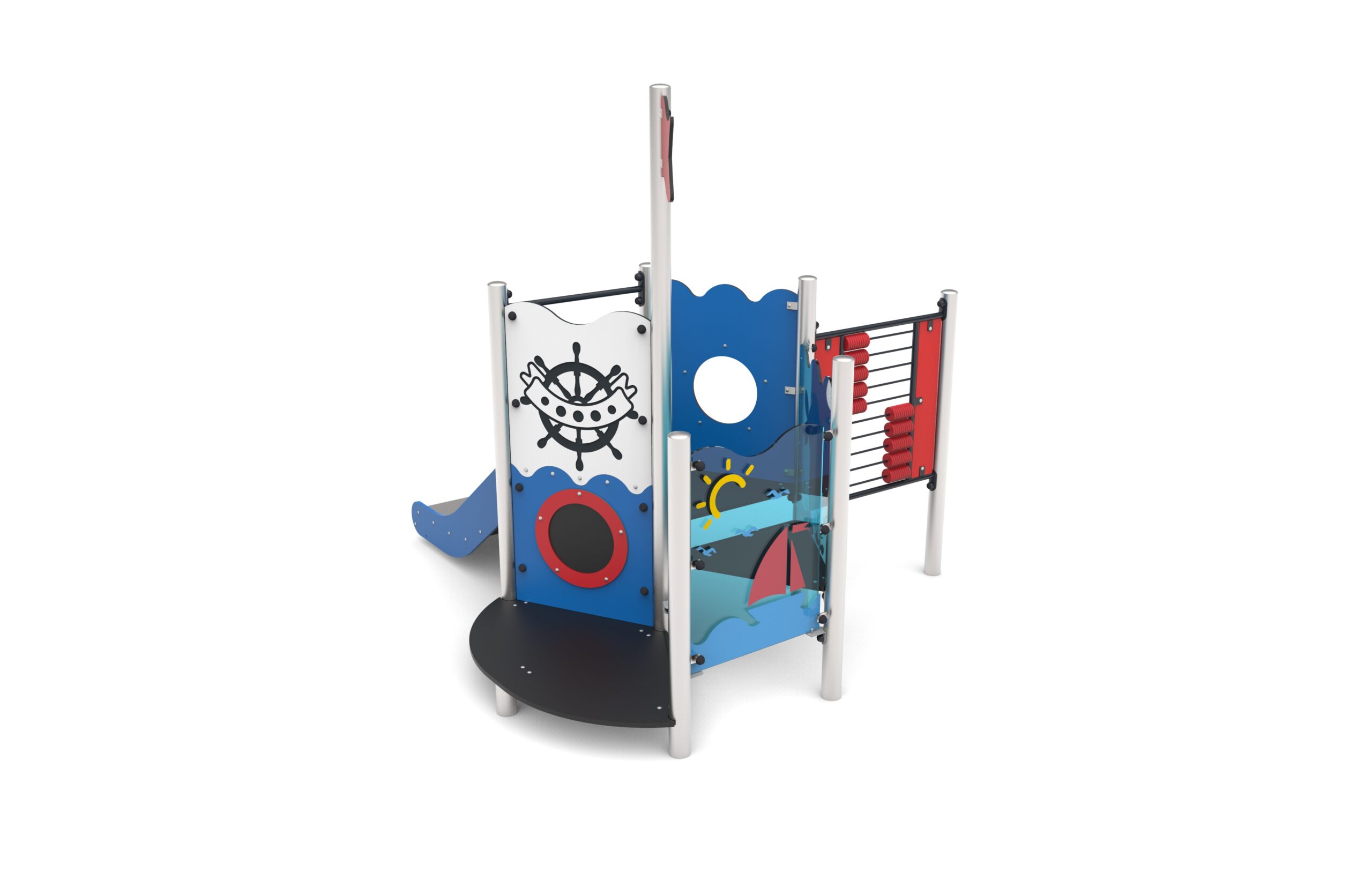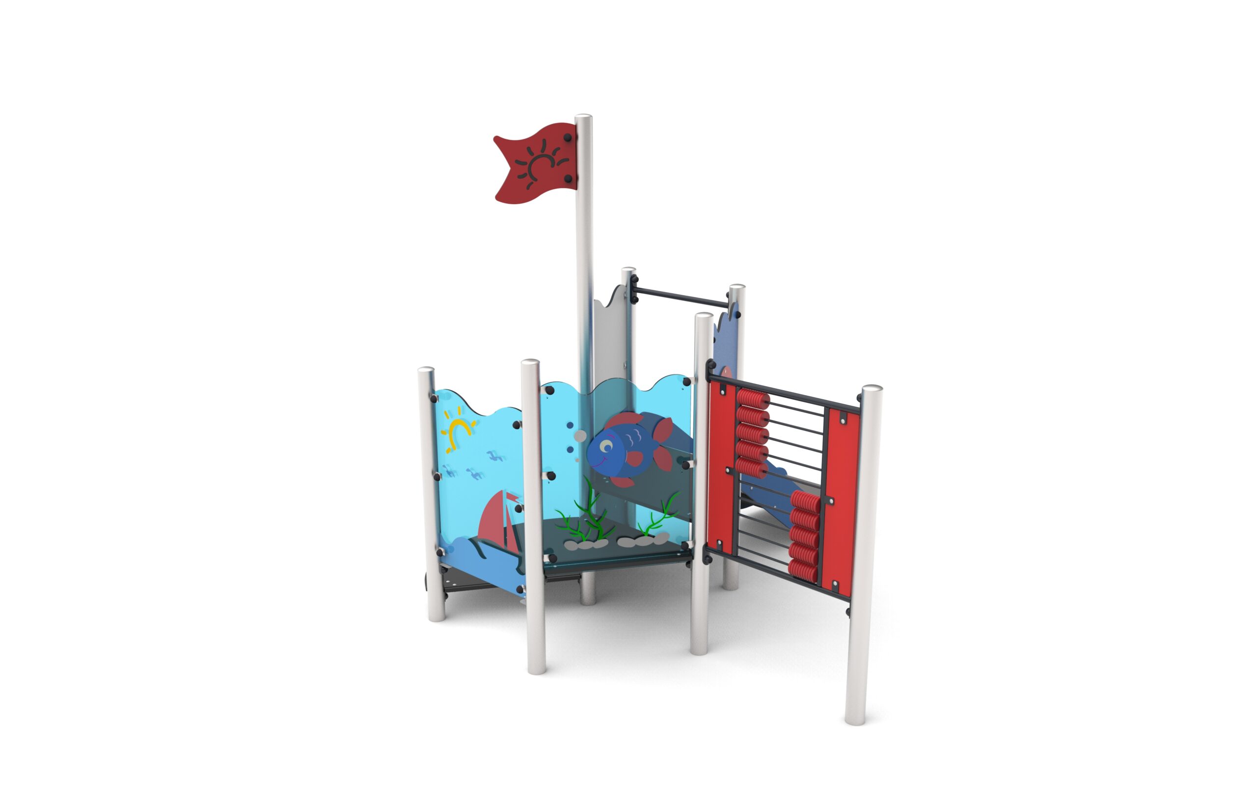 Urządzenie na słupach stalowych okrągłych. Podesty wykonane z płyt pokrytych warstwą antypoślizgową wspartych na spawanej stalowej ramie. Barierki wzmocnione walcowanymi rurkami stalowymi, część barierek wykonana z poliwęglanu z transparentnym nadruiem. Zwężki wykonane ze spawanych rur stalowych. Słupy zakończone sferycznymi zaślepkami z gumy.