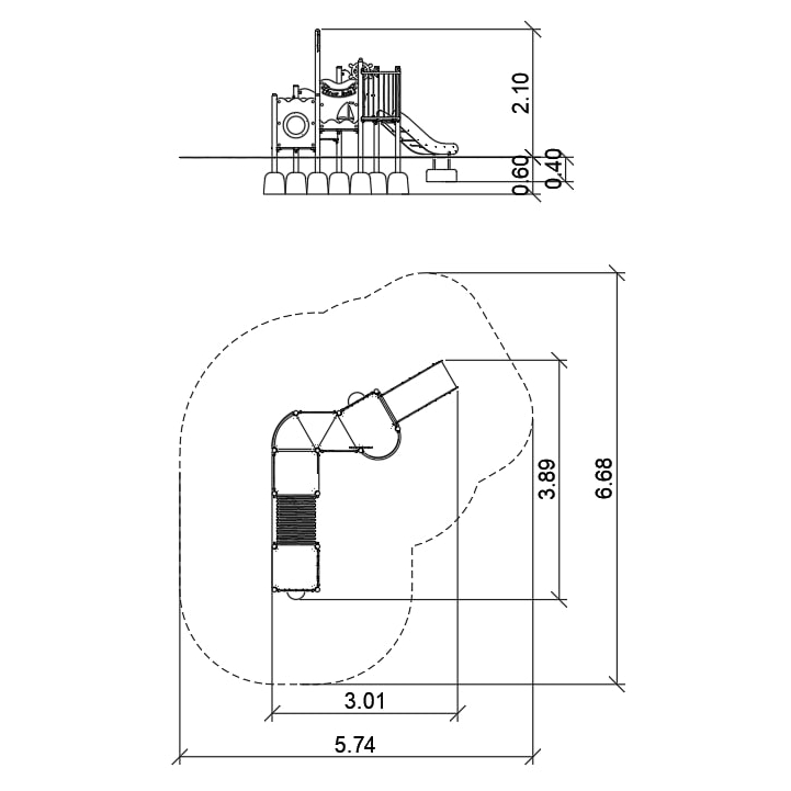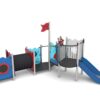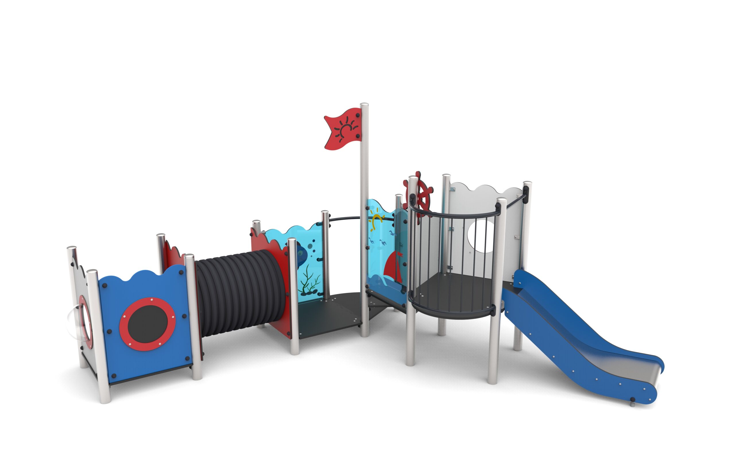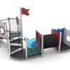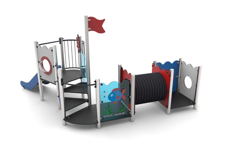 Urządzenie na słupach stalowych okrągłych. Podesty wykonane z płyt pokrytych warstwą antypoślizgową wspartych na spawanej stalowej ramie. Barierki wzmocnione walcowanymi rurkami stalowymi, część barierek wykonana z poliwęglanu z transparentnym nadruiem. Zwężki wykonane ze spawanych rur stalowych. Słupy zakończone sferycznymi zaślepkami z gumy.