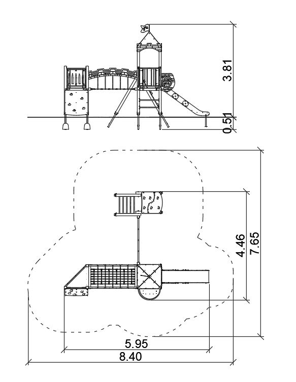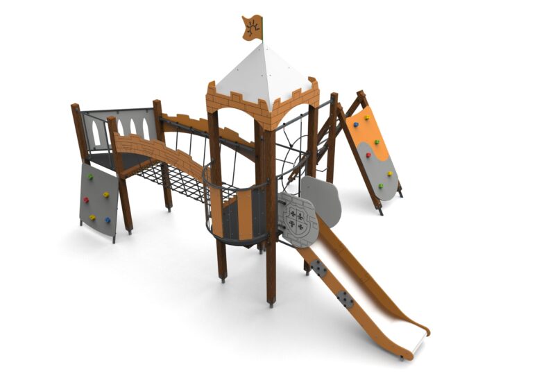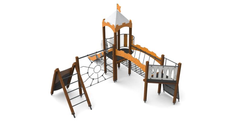 Urządzenie z aplikacjami zamkowymi, na drewnianych słupach o przekroju kwadratowym. Podesty pokryte powłoką antypoślizgową, barierki wzmocnione rurkami stalowymi na górze i na dole. Zwężki ze spawanych rur stalowych.