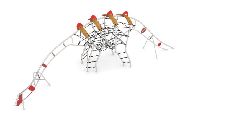 Urządzenie w formie diplodoka z giętych i walcowanych rur okrągłych i belek z giętego drewna klejonego składającego. Nogi z rur stalowych w formie drabinek linowych. Brzuch wykonany w formie linarium przestrzennego.