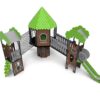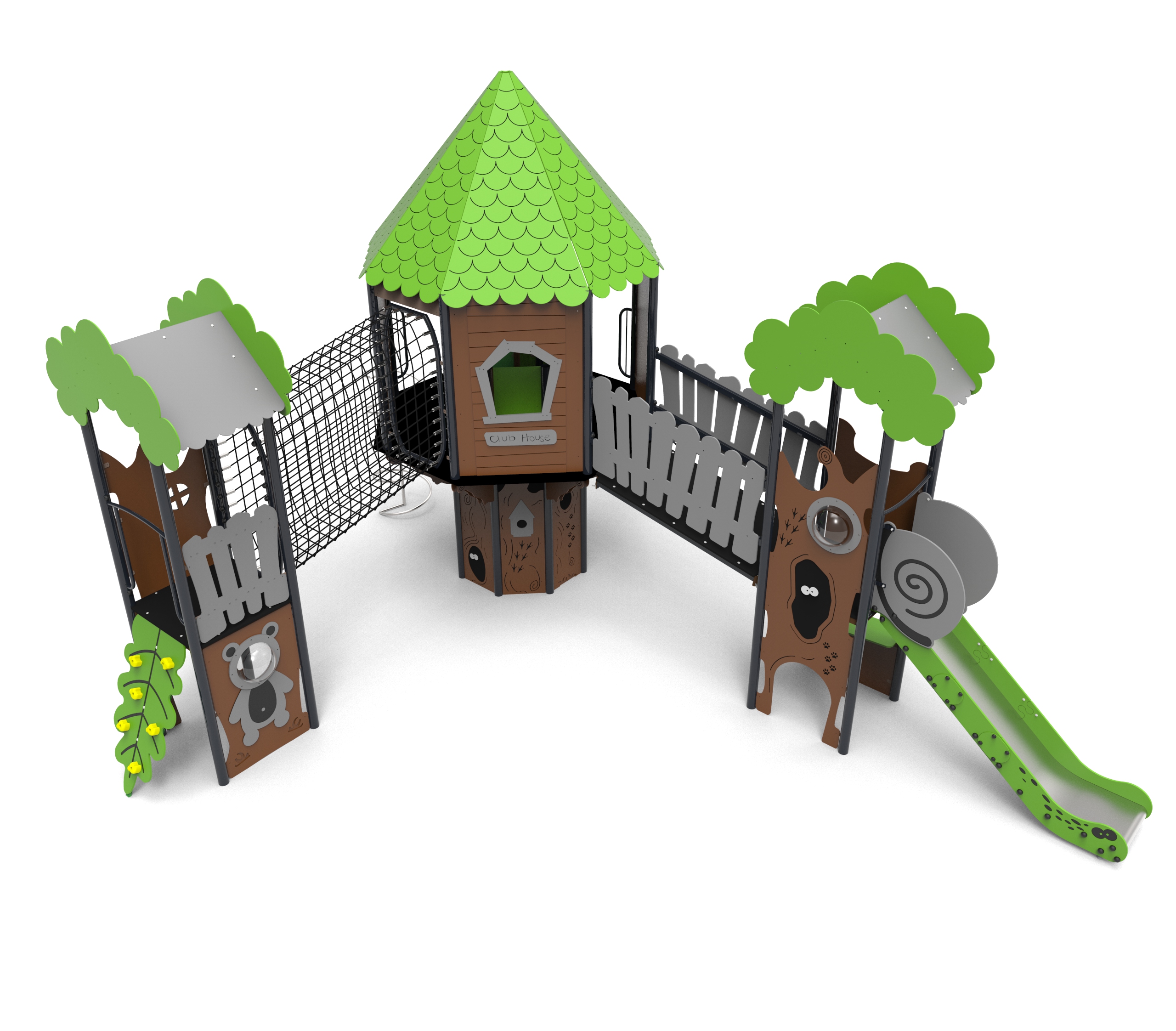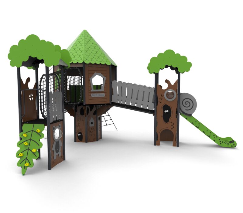 Urządzenia łatwodostępne z domem ze schodami zabiegowymi, którego górna platforma wystaje ponad podstawę. Dom jest na planie ośmioboku z ośmiospadowym dachem. Całość gęsto pokryta aplikacjami w tematyce leśnej. Podesty wykonane z płyt pokrytych warstwą antypoślizgową wspartych na stalowych spawanych ramach. Barierki z płyt HDPE o grubości 15 mm z frezowaniami wzmocnionych stalowymi ramami na górze i dole.