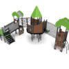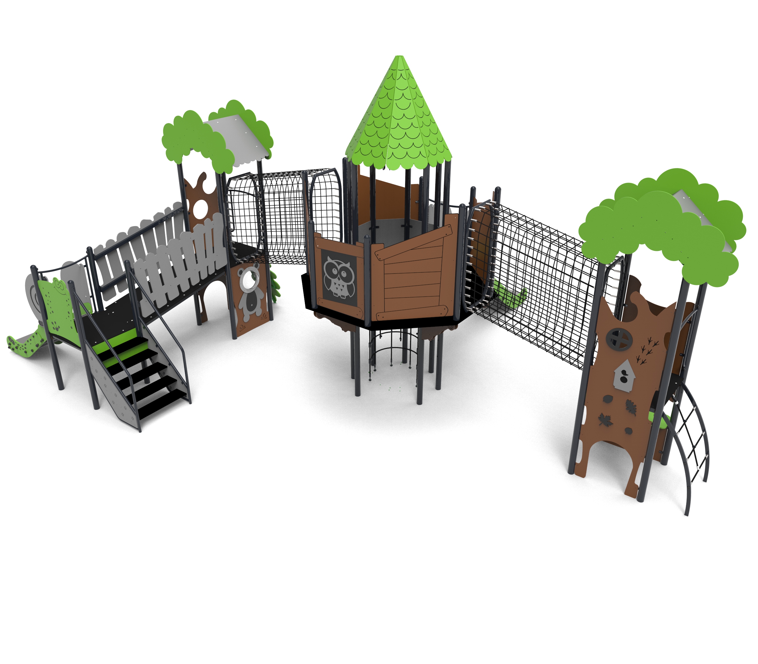 Urządzenia łatwodostępne z domem ze schodami zabiegowymi, którego górna platforma wystaje ponad podstawę. Dom jest na planie ośmioboku z ośmiospadowym dachem. Całość gęsto pokryta aplikacjami w tematyce leśnej. Podesty wykonane z płyt pokrytych warstwą antypoślizgową wspartych na stalowych spawanych ramach. Barierki z płyt HDPE o grubości 15 mm z frezowaniami wzmocnionych stalowymi ramami na górze i dole.