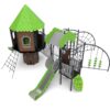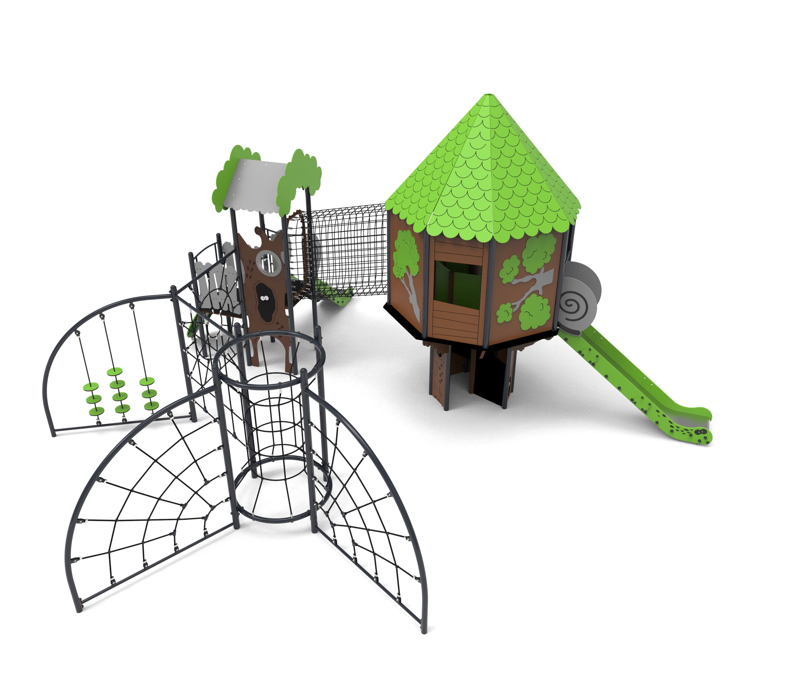 Urządzenia łatwodostępne z domem ze schodami zabiegowymi, którego górna platforma wystaje ponad podstawę. Dom jest na planie ośmioboku z ośmiospadowym dachem. Całość gęsto pokryta aplikacjami w tematyce leśnej. Podesty wykonane z płyt pokrytych warstwą antypoślizgową wspartych na stalowych spawanych ramach. Barierki z płyt HDPE o grubości 15 mm z frezowaniami wzmocnionych stalowymi ramami na górze i dole.