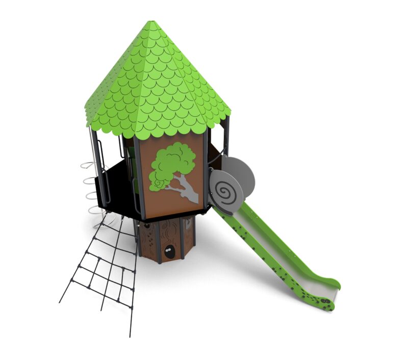 Urządzenia łatwodostępne z domem ze schodami zabiegowymi, którego górna platforma wystaje ponad podstawę. Dom jest na planie ośmioboku z ośmiospadowym dachem. Całość gęsto pokryta aplikacjami w tematyce leśnej. Podesty wykonane z płyt pokrytych warstwą antypoślizgową wspartych na stalowych spawanych ramach. Barierki z płyt HDPE o grubości 15 mm z frezowaniami wzmocnionych stalowymi ramami na górze i dole.