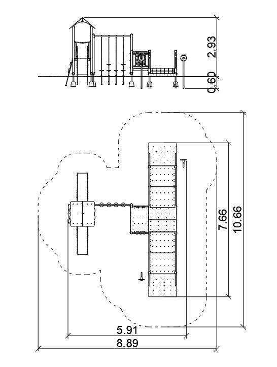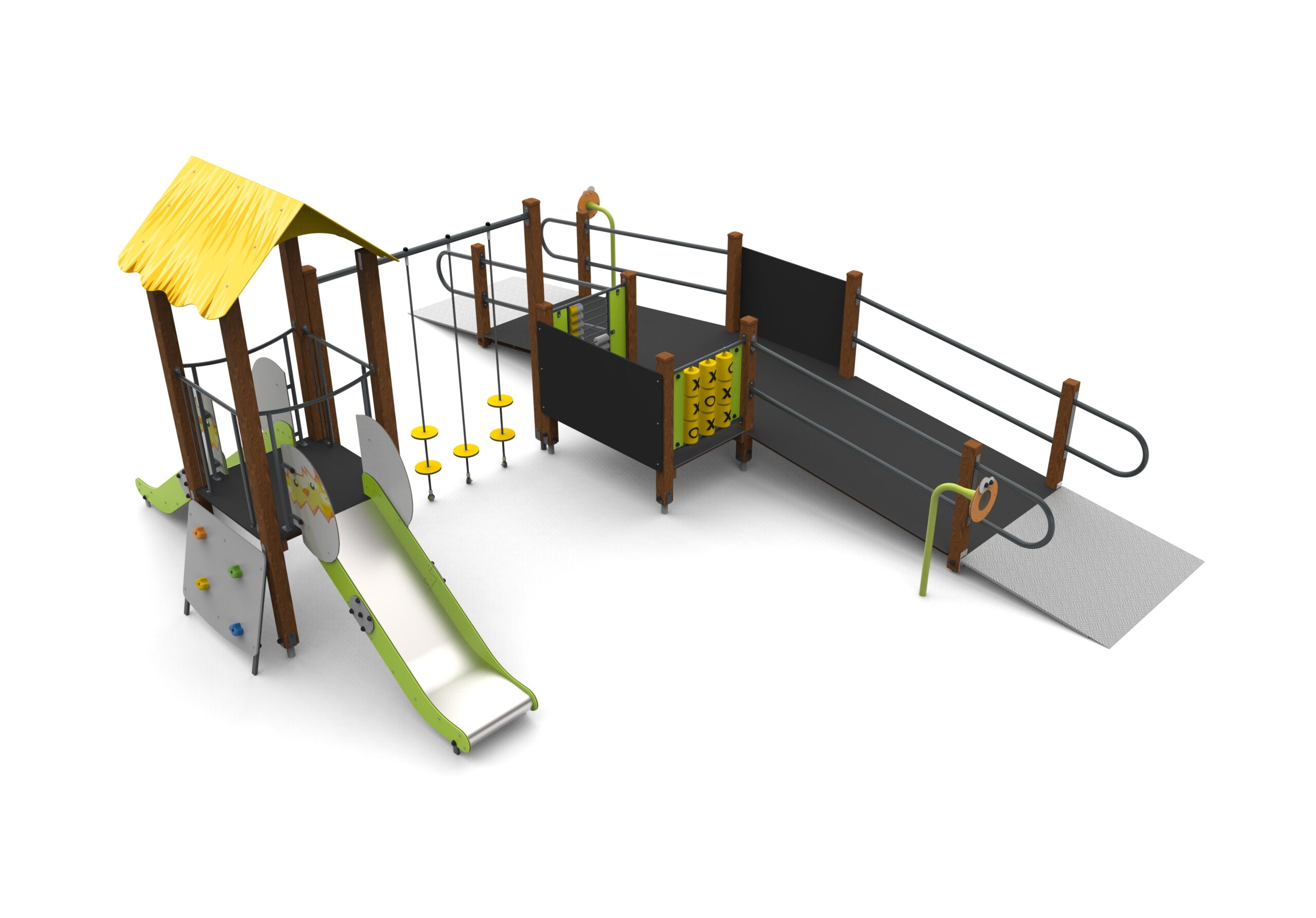 Urządzenie z aplikacjami wiejskimi, na drewnianych słupach o przekroju kwadratowym. Podesty pokryte powłoką antypoślizgową, barierki wzmocnione rurkami stalowymi na górze i na dole, płyty pokryte drukiem UV. Zwężki ze spawanych rur stalowych.