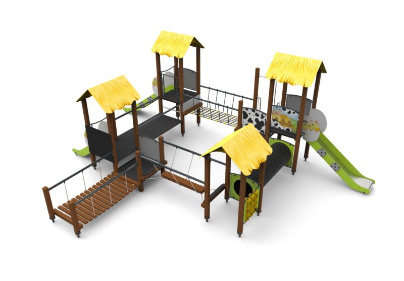 Urządzenie z aplikacjami wiejskimi, na drewnianych słupach o przekroju kwadratowym. Podesty pokryte powłoką antypoślizgową, barierki wzmocnione rurkami stalowymi na górze i na dole, płyty pokryte drukiem UV. Zwężki ze spawanych rur stalowych.