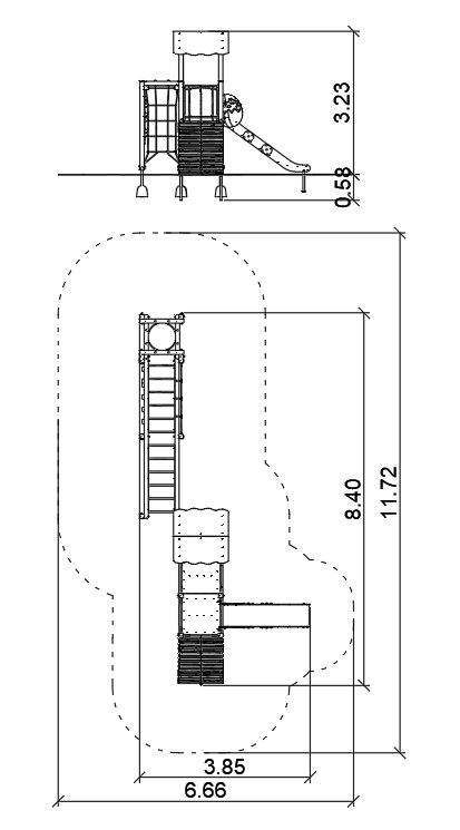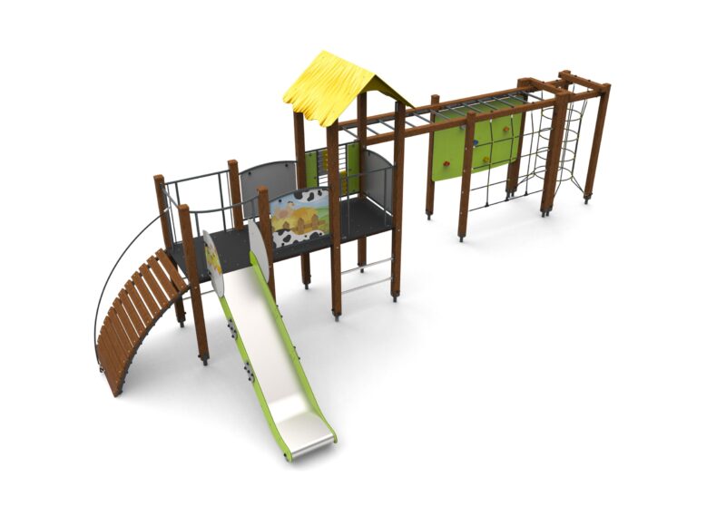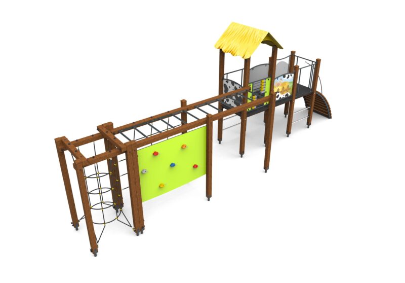 Urządzenie z aplikacjami wiejskimi, na drewnianych słupach o przekroju kwadratowym. Podesty pokryte powłoką antypoślizgową, barierki wzmocnione rurkami stalowymi na górze i na dole, płyty pokryte drukiem UV. Zwężki ze spawanych rur stalowych.
