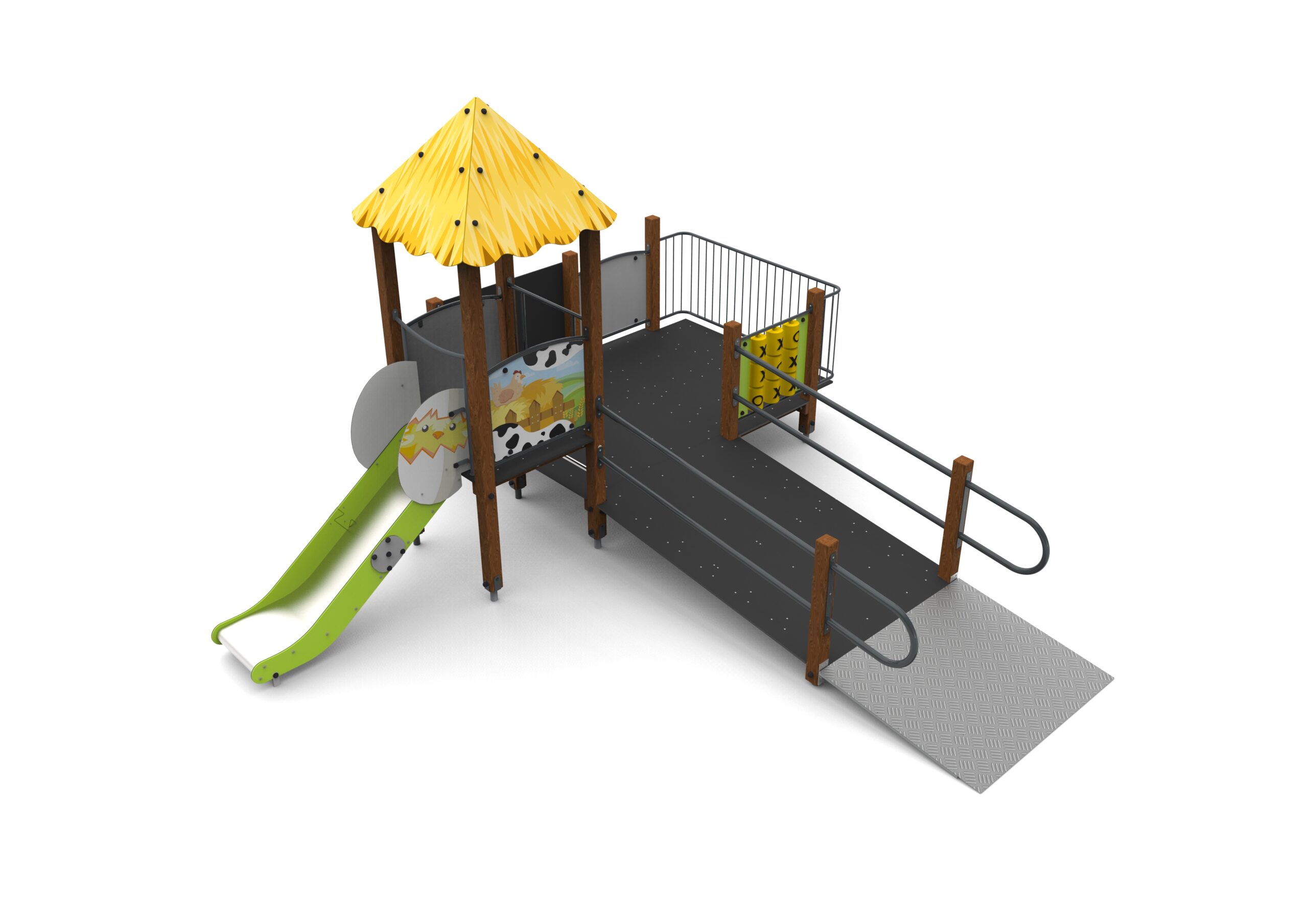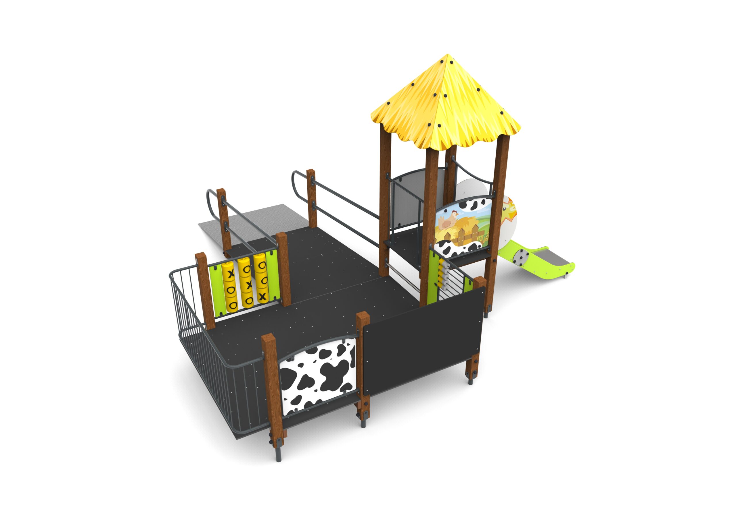 Urządzenie z aplikacjami wiejskimi, na drewnianych słupach o przekroju kwadratowym. Podesty pokryte powłoką antypoślizgową, barierki wzmocnione rurkami stalowymi na górze i na dole, płyty pokryte drukiem UV. Zwężki ze spawanych rur stalowych.