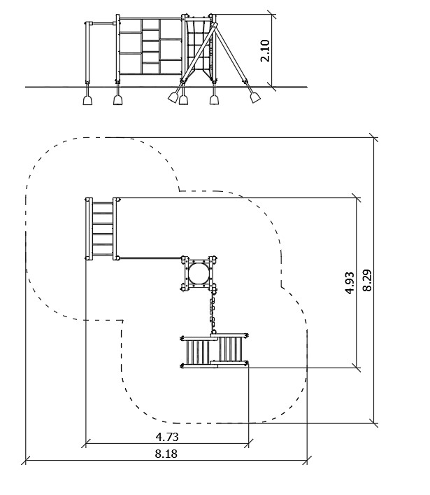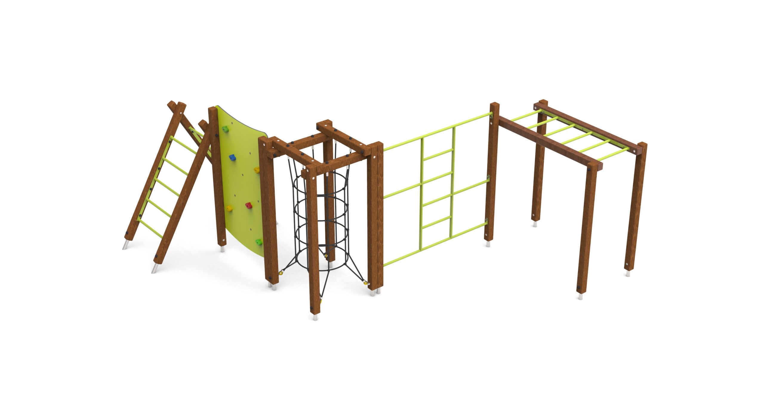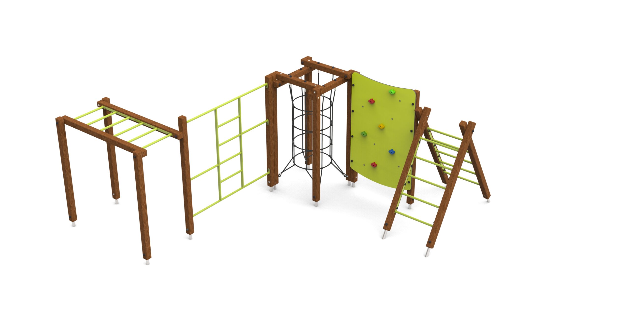 Urządzenie sprawnościowe, na drewnianych słupach o przekroju kwadratowym. Podesty pokryte powłoką antypoślizgową.