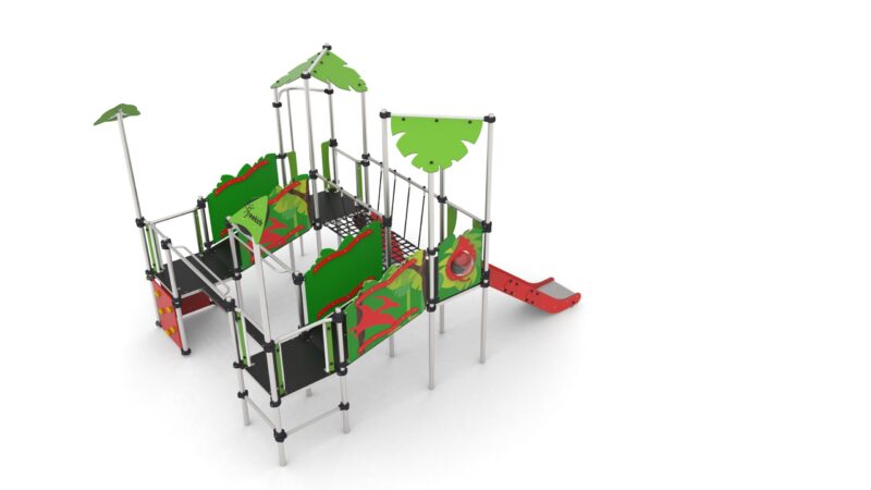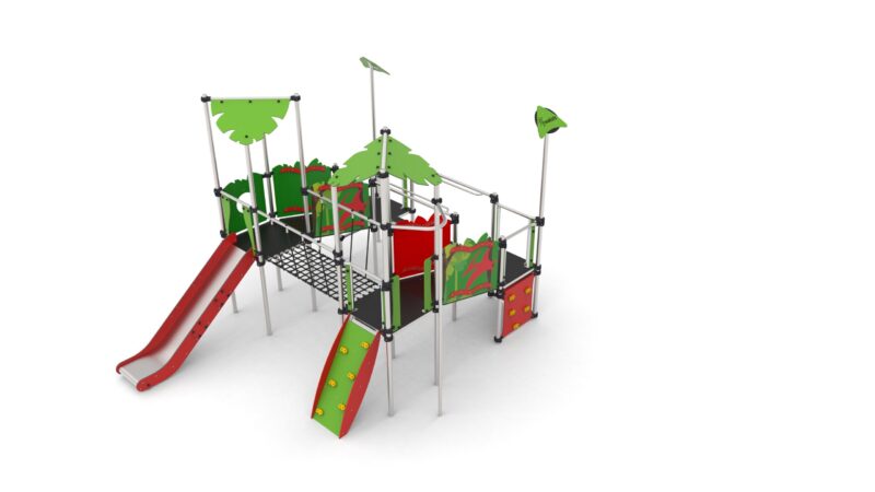 Urządzenie na słupach okrągłych z obejmami aluminiowymi. Podesty pokryte powłoką antypoślizgową wsparte na spawanej ramie stalowej. Barierki pokryte drukiem UV.