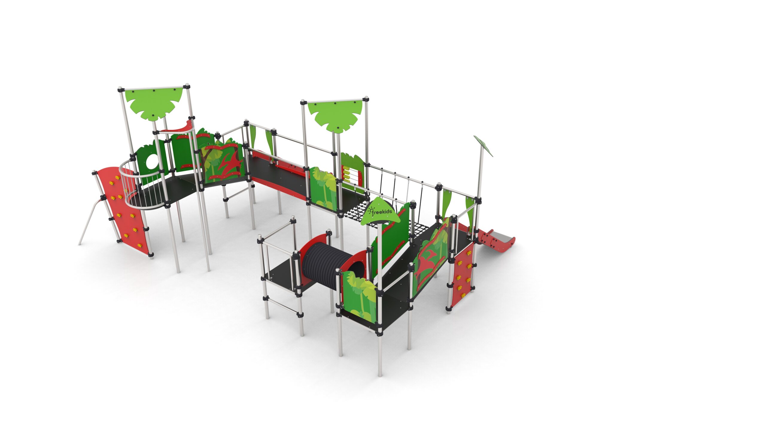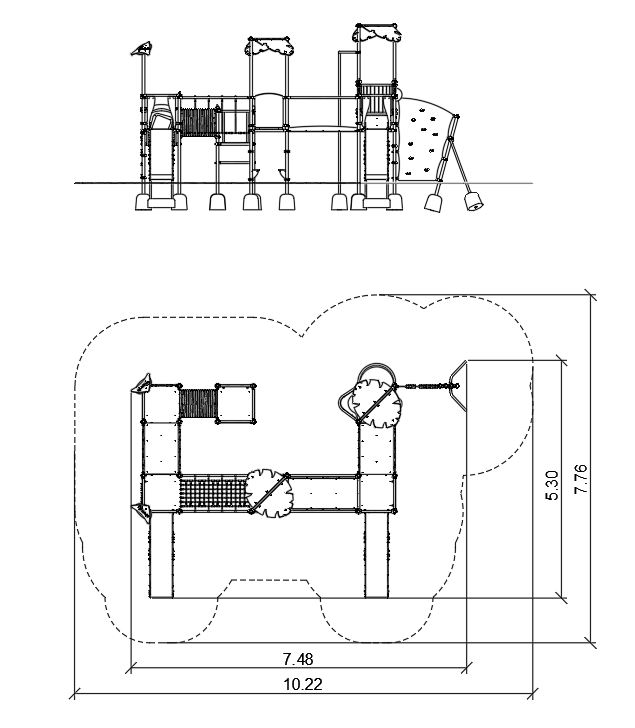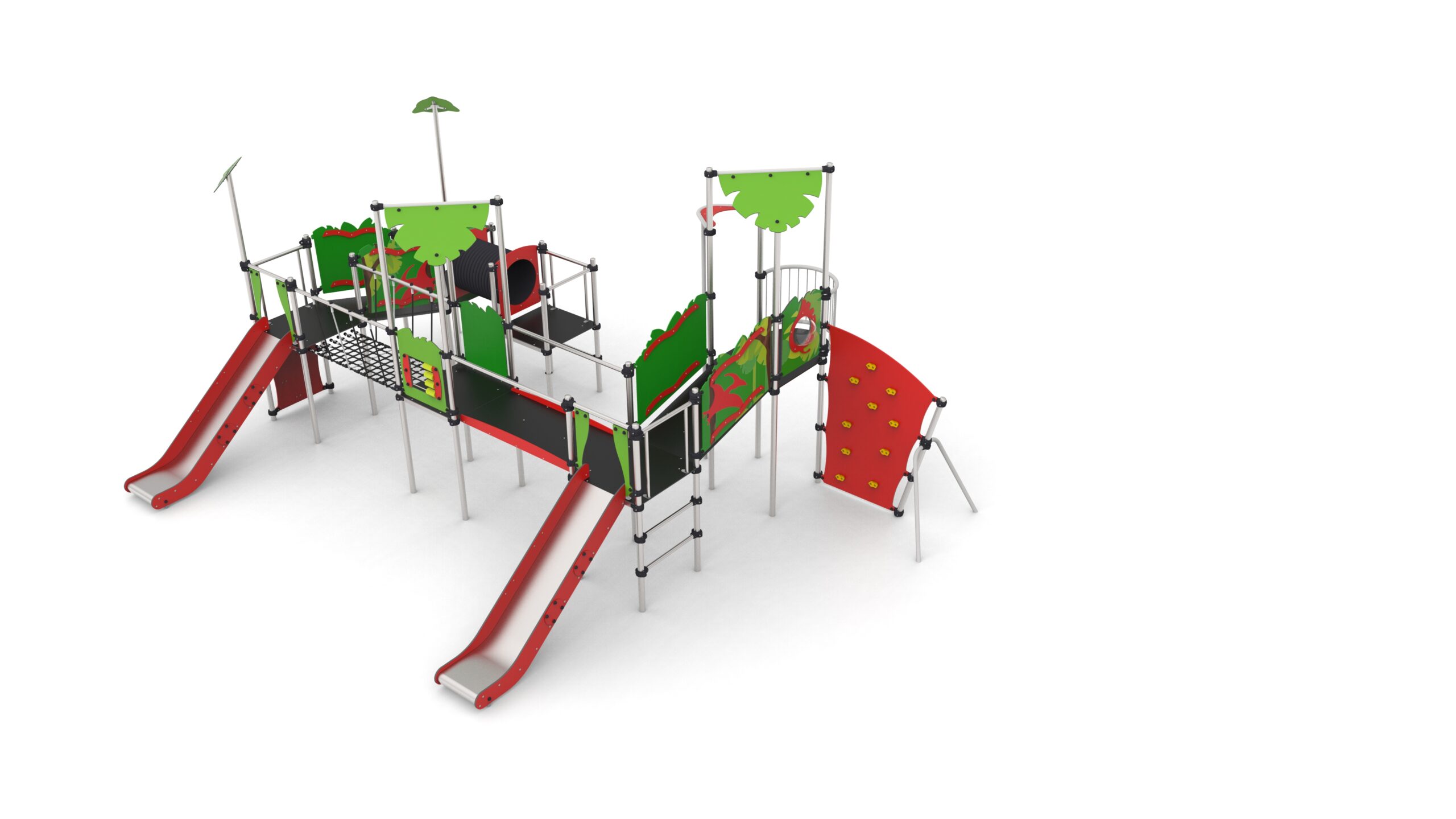 Urządzenie na słupach okrągłych z obejmami aluminiowymi. Podesty pokryte powłoką antypoślizgową wsparte na spawanej ramie stalowej. Barierki pokryte drukiem UV.