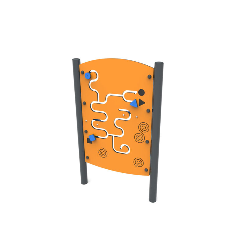 Urządzenie na słupach stalowych okrągłych. Słupy zakończone sferycznymi zaślepkami z gumy. Panele manipulacyjne o wymiarach co najmniej 100x70cm.