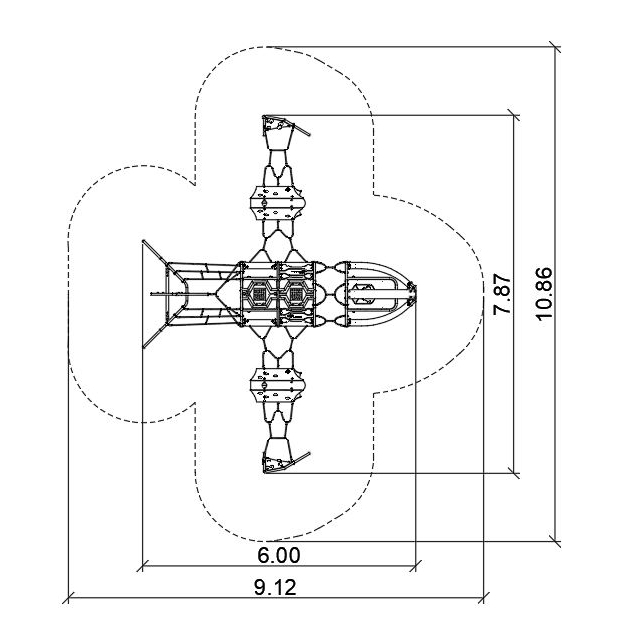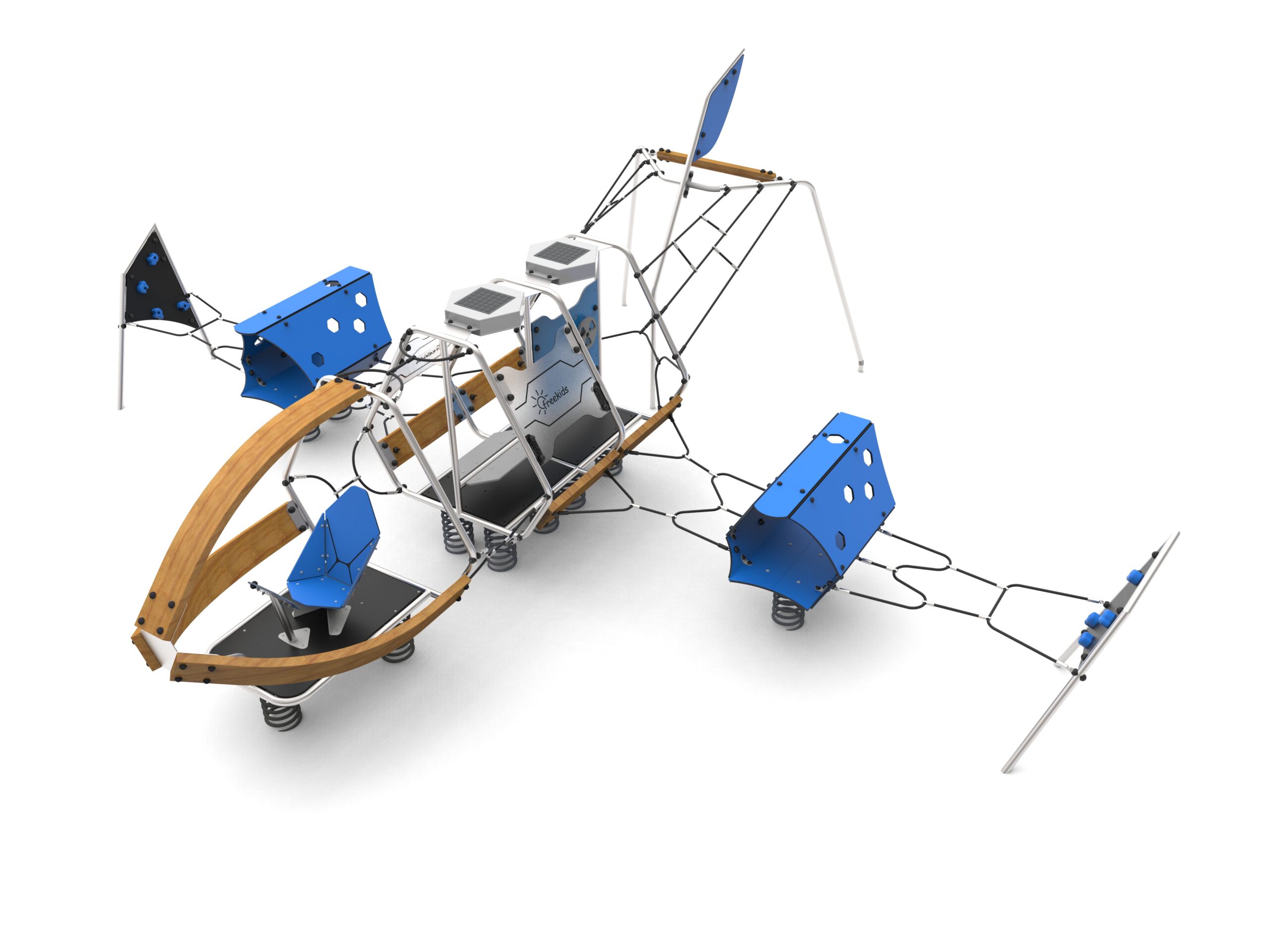 Urzadzenie w kształcie futurystycznego samolotu, posadowionego na sprężynach. Wykonanego ze spawanej nierdzewnej ramy i belek z giętego drewna klejonego. Urządzenie wyposażone w fotel z HDPE i stali nierdzewnej, dwa panele świetlne ładowane fotowoltaiką i załączające się po zmroku zamknięte w metalowej obudowie, dwie skośne ścianki wspinaczkowe, dwa tunele z HDPE w formie silników, poziome linarium, dwa ślizgi strażackie oraz elementy manipulacyjne.