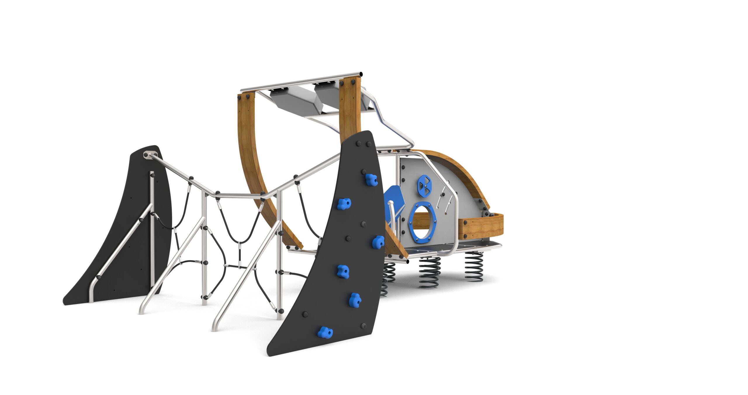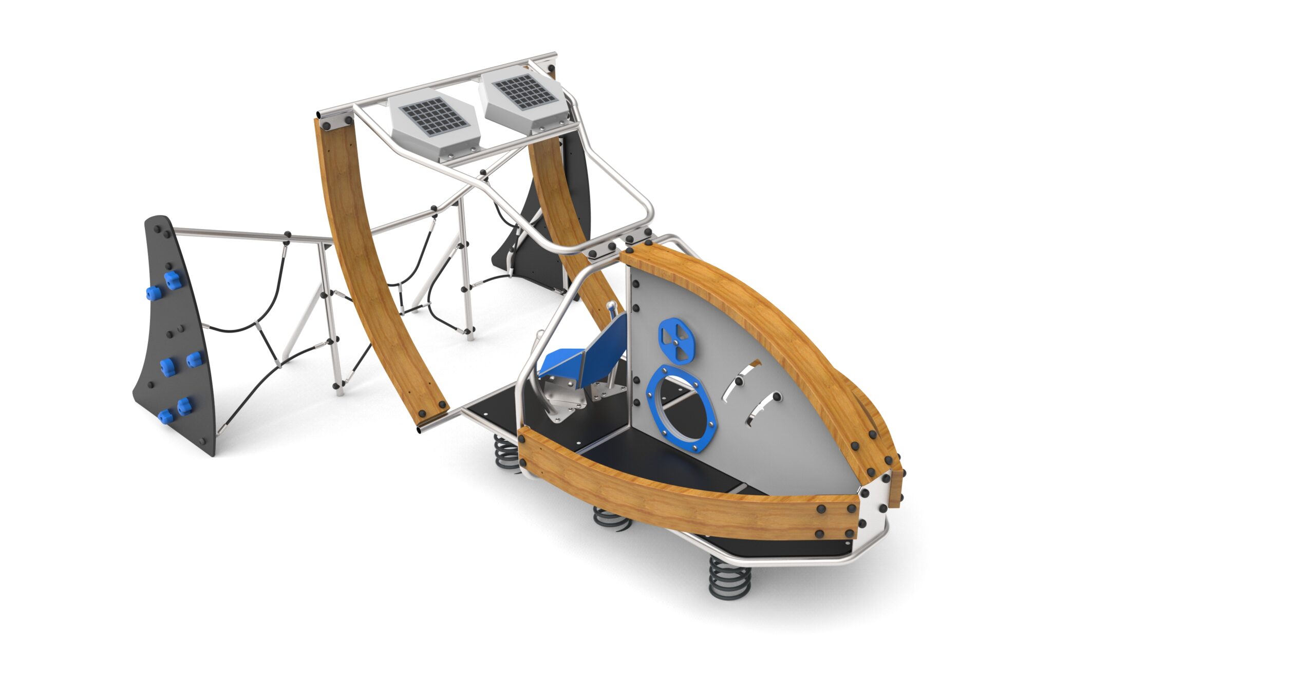 Urzadzenie w kształcie futurystycznego spychacza, posadowionego na sprężynach. Wykonanego ze spawanej nierdzewnej ramy i belek z giętego drewna klejonego. Urządzenie wyposażone w fotel z HDPE i stali nierdzewnej, dwa panele świetlne ładowane fotowoltaiką i załączające się po zmroku zamknięte w metalowej obudowie, dwie pionowe ścianki wspinaczkowe, pionowe linarium oraz elementy manipulacyjne.