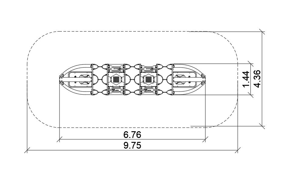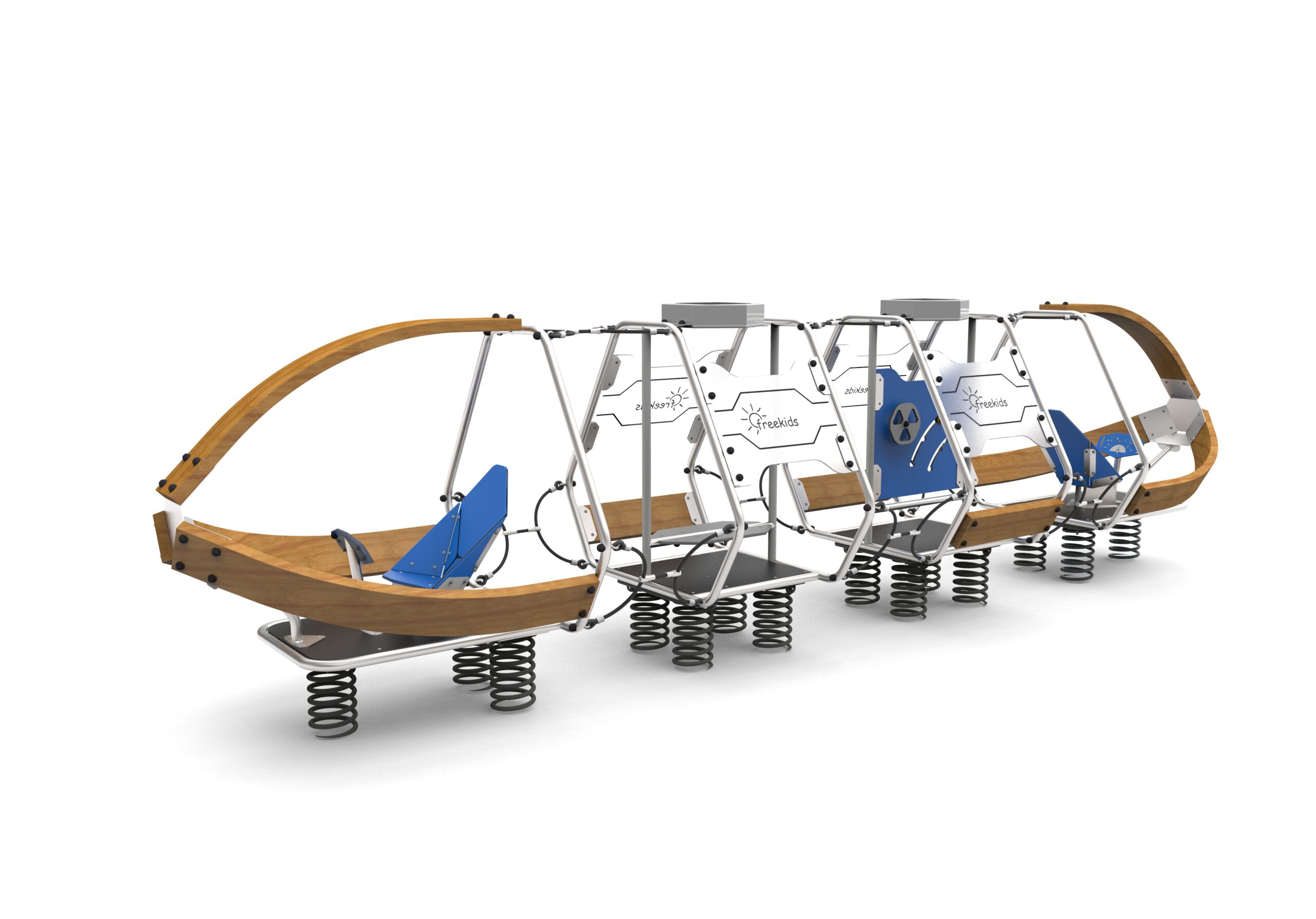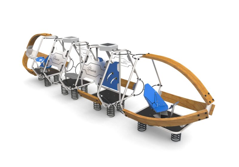 Urzadzenie w kształcie futurystycznego tramwaju, posadowionego na sprężynach i skaładającego się z 4 segmentów połączonych linami. Wykonanego ze spawanej nierdzewnej ramy i belek z giętego drewna klejonego. Urządzenie wyposażone w fotele z HDPE i stali nierdzewnej, dwa panele świetlne ładowane fotowoltaiką i załączające się po zmroku zamknięte w metalowej obudowie, ławeczkę dla pasażerów, poliwęglanowe szyby, oraz elementy manipulacyjne.