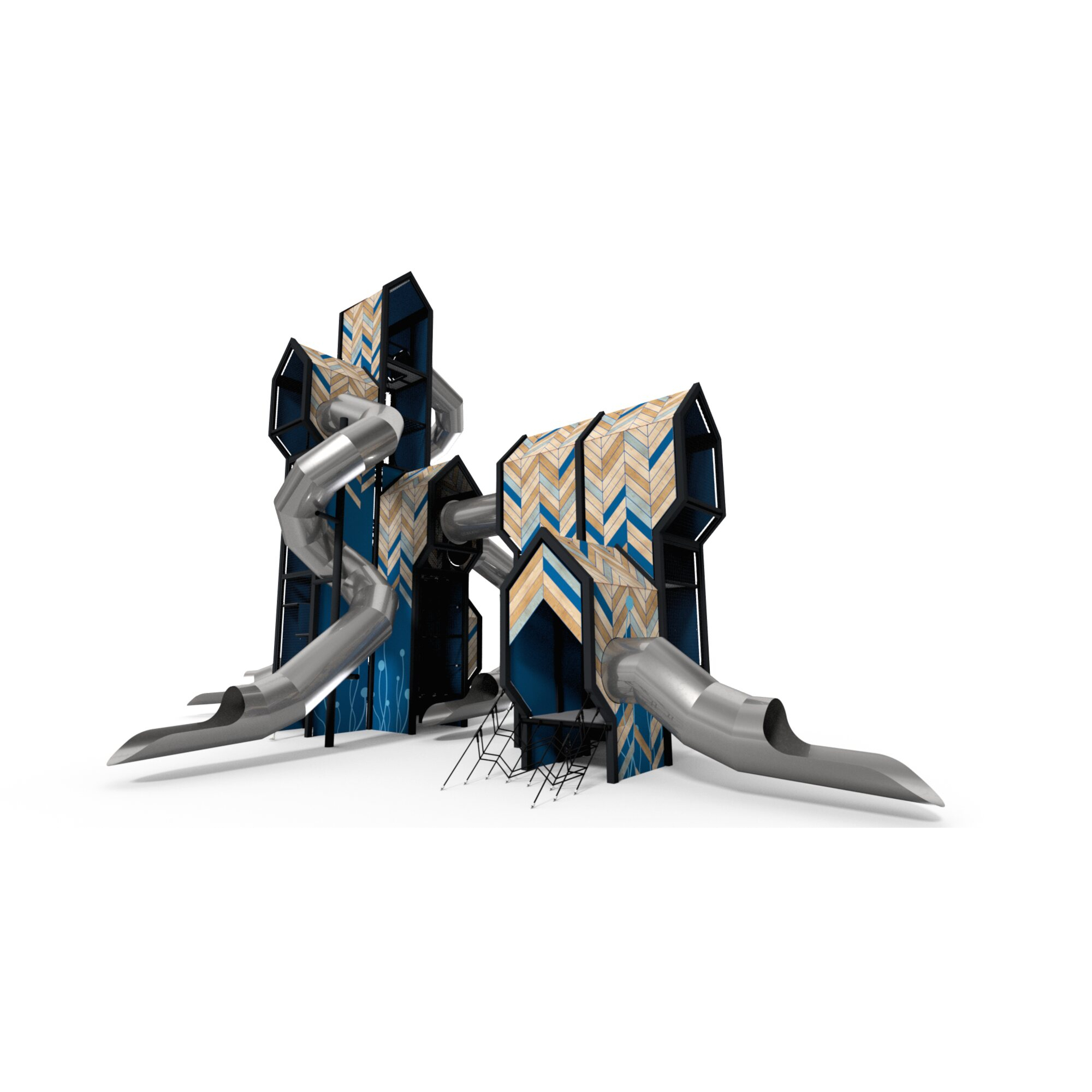Urządzenie w formie wieży widokowej otoczonej zjeżdżalniami rurowymi z różnymi fomrmami wejść wewnątrz. Co druga ściana wykonana z perforowanej blachy zapewniającej widoczność dzieci we wnętrzu urządzenia oraz wentylację. Szczytowe punkty widokowe urządzenia poszerzone względem podstawy urządzenia, zapewniajace lepszą widoczność. Środkowy pionowy ciąg komunikacyjny wykonanay w sposób umożliwiający sprowadzenie dziecka z samej góry na dół przez osobę dorosłą.