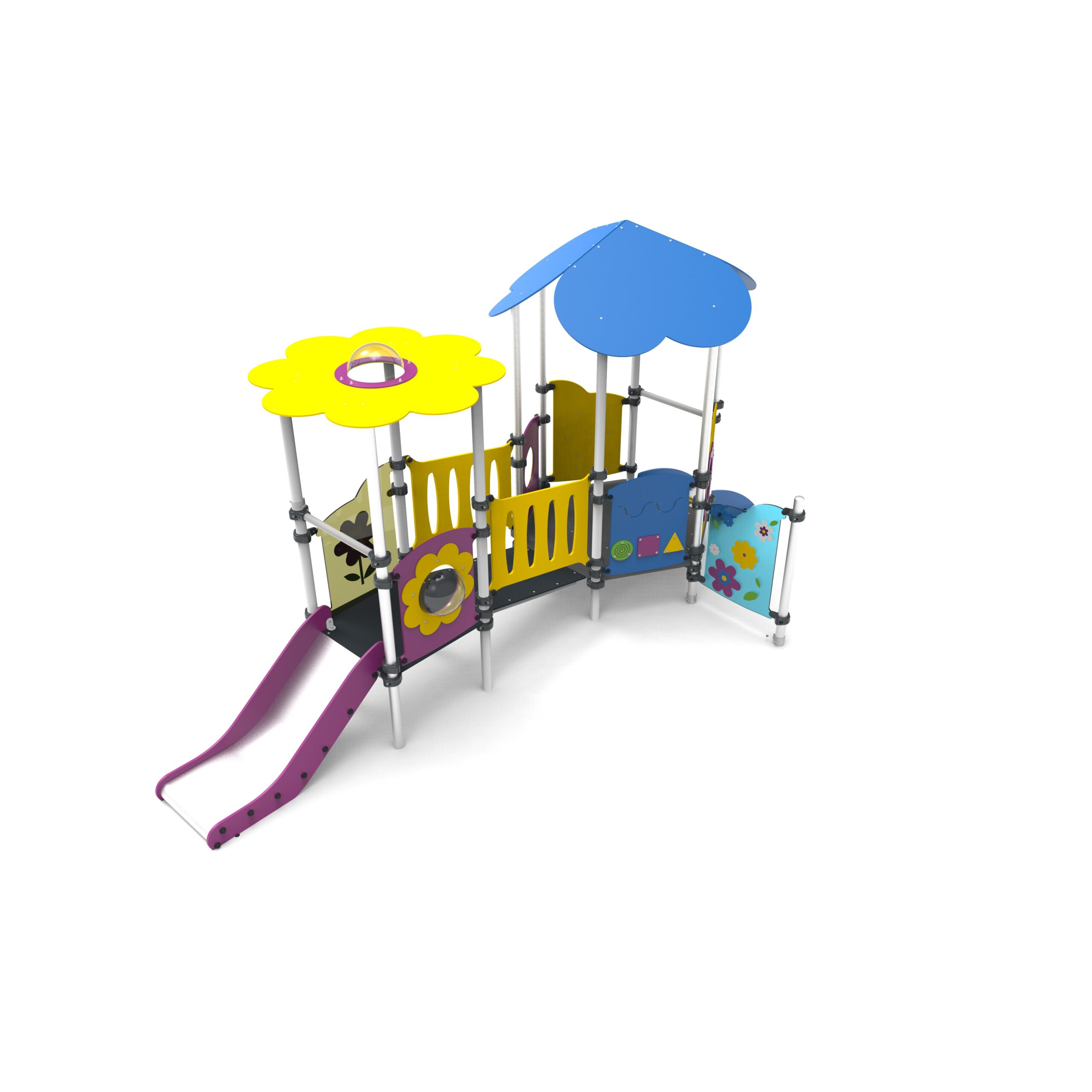 Urządzenie na słupach okrągłych z obejmami aluminiowymi. Podesty pokryte powłoką antypoślizgową wsparte na spawanej ramie stalowej. Dachy płaskie wyposażone w bulaj sferyczny. Barierki z poliwęglanu z transparentnym nadrukiem UV.