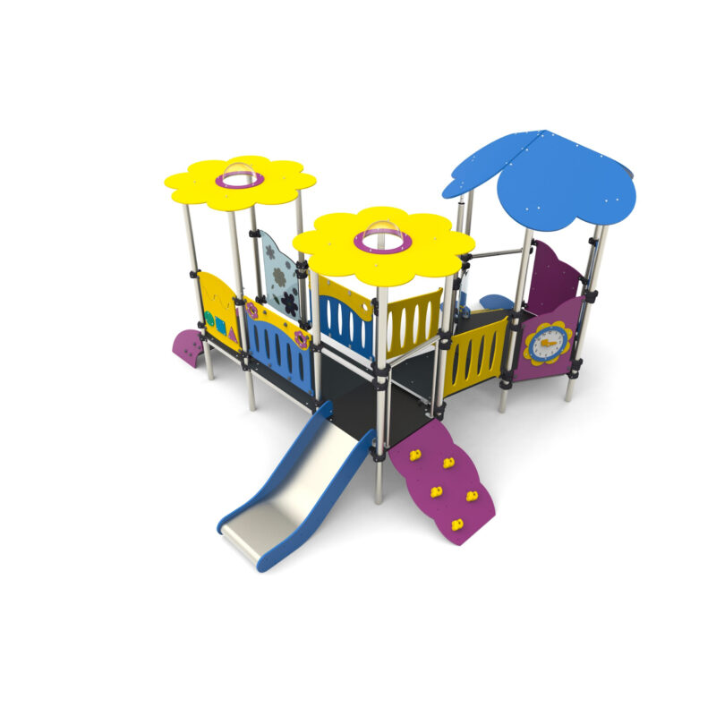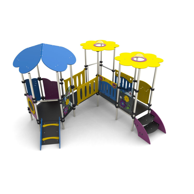 Urządzenie na słupach okrągłych z obejmami aluminiowymi. Podesty pokryte powłoką antypoślizgową wsparte na spawanej ramie stalowej. Dachy płaskie wyposażone w bulaj sferyczny. Barierki z poliwęglanu z transparentnym nadrukiem UV.