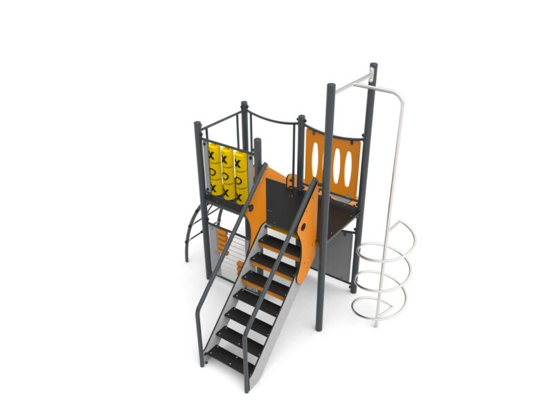 Urządzenie na słupach stalowych okrągłych. Podesty wykonane z płyt pokrytych warstwą antypoślizgową wspartych na spawanej stalowej ramie. Barierki wzmocnione walcowanymi rurkami stalowymi. Zwężki wykonane z spawanych rur stalowych. Słupy zakończone sferycznymi zaślepkami z gumy.