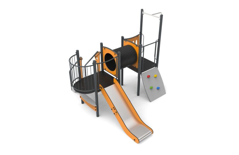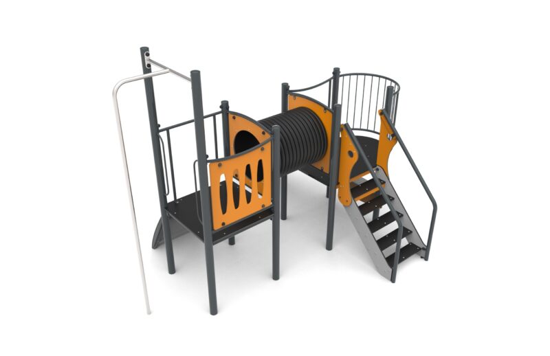 Zestaw zabawowy Moon 2 to konstrukcja oparta na okrągłych słupach stalowych, której sercem jest łącznik w postaci tunelu. Urządzenie posiada wygodne schodki wejściowe oraz rurę strażacką do szybkiego zjazdu. Podesty z warstwą antypoślizgową na stalowej ramie oraz barierki wzmocnione rurkami gwarantują pełne bezpieczeństwo. Całość wykończona sferycznymi, gumowymi zaślepkami słupów.