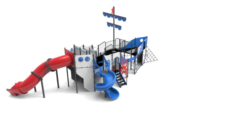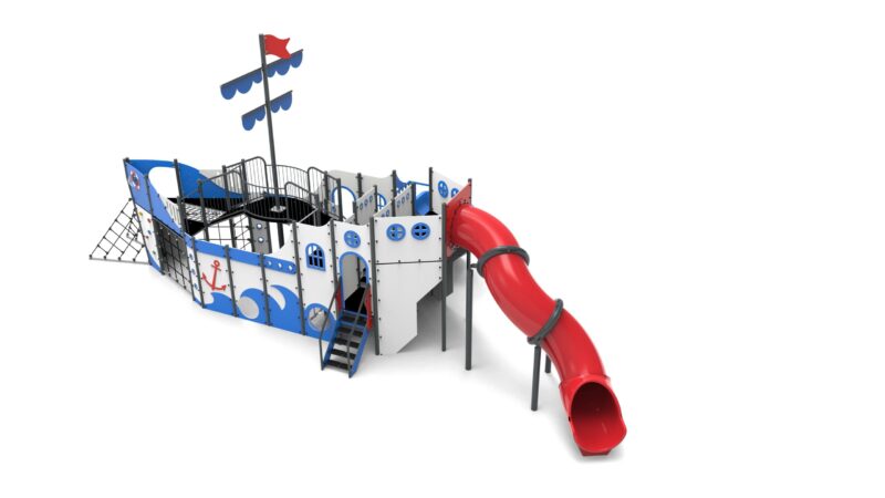 Urządzenie w kształcie okrętu posiadające w centralnej części maszt z wyniesionym w górę owalnym balkonem z którego można przejść na dziób i rufę statku. Część dziobowa wyposażona w ścianki wspinaczkowe, pionowe i poziome siatki linowe. Na rufie dwie zjeżdżalnie, wyższa rurowa i kręta, niższa otwarta ułożona spiralnie.Na statek prowadzą dwie pary prostych schodów i jedne schody spiralne. Całość ozdobiona licznymi aplikacjami morskimi i bulajami.