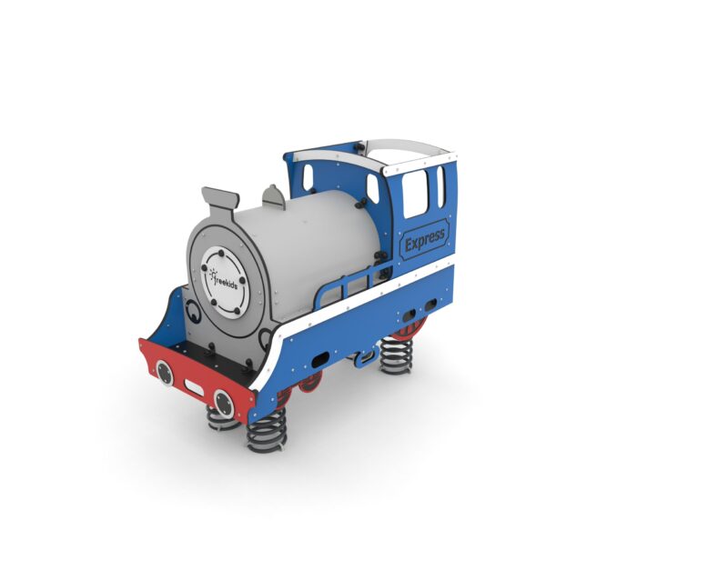Urządzenie w formie parowozu wykonanego z giętego HDPE, z otworami po bokach na stopy i recę umożliwiającymi zabawę w kowbojów. Dodatkowo wyposażony w ruchomą wajchę i pokrętło.