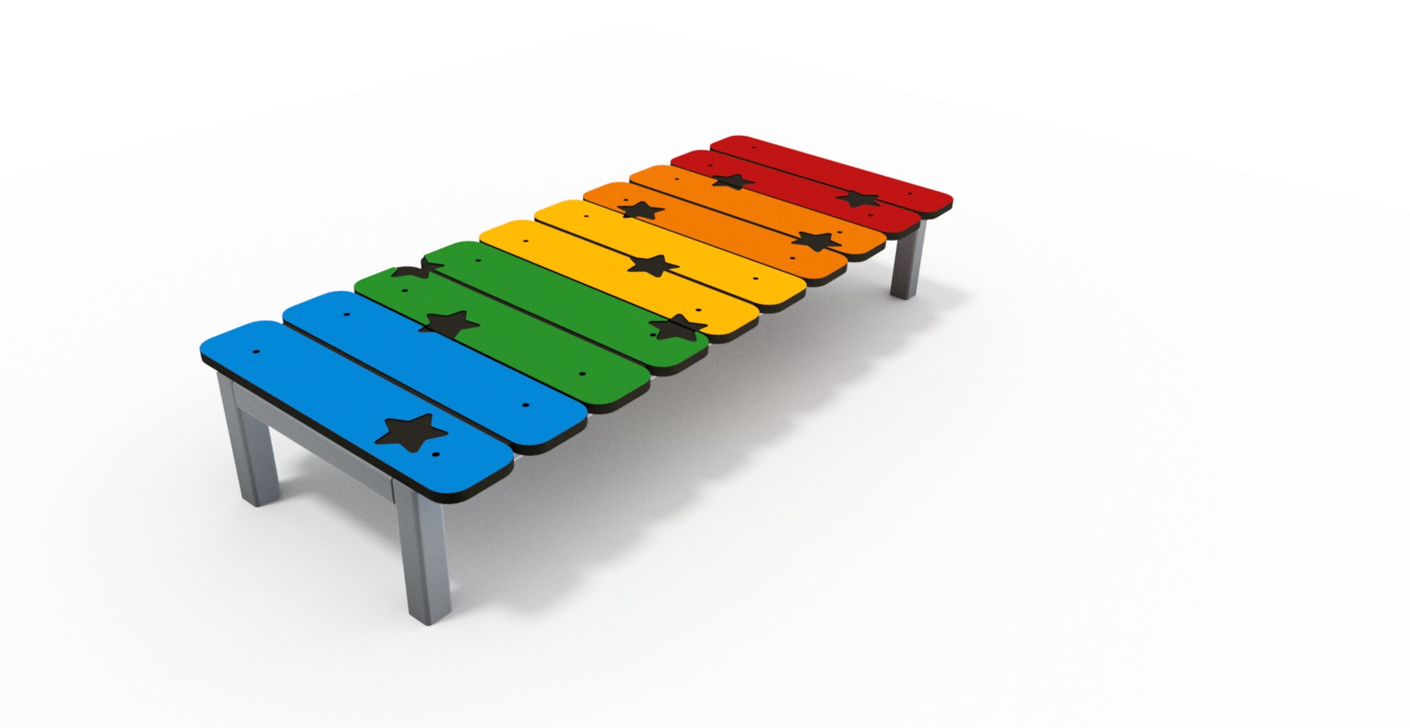Platforma z różnokolorowego HDPE w formie tęczy, na stalowej ramie.