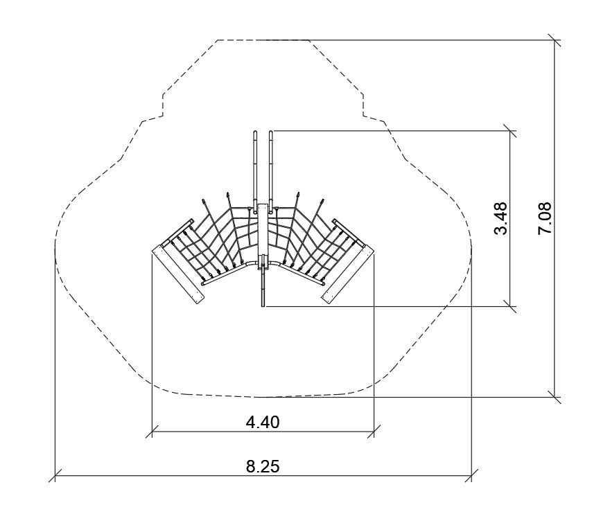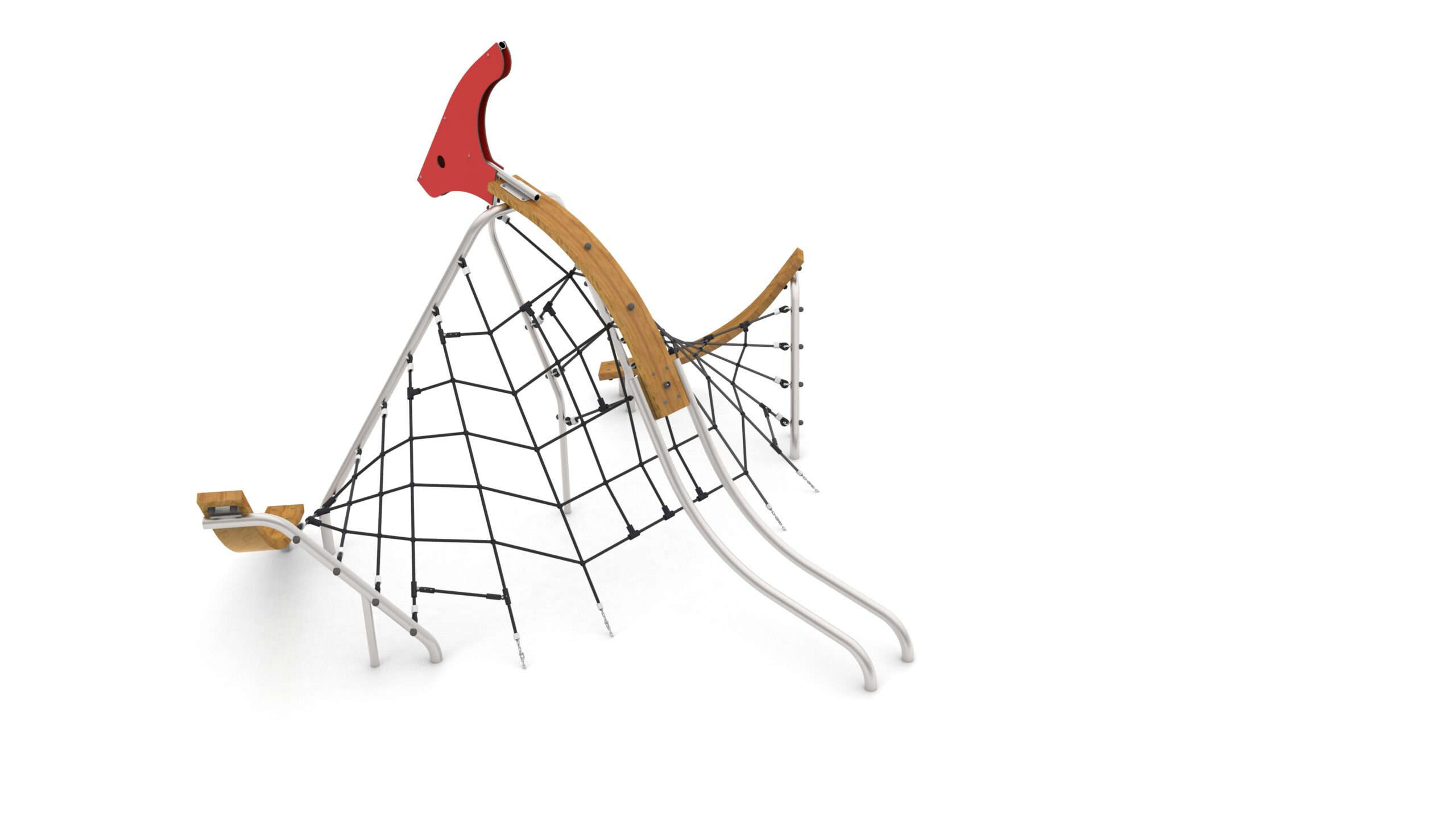 Urządzenie w formie pterozaura z rur okrągłych i belek z giętego drewna klejonego składającego się z nieregularnie wygiętej siatki linowej i dwóch ślizgów z giętych rur.