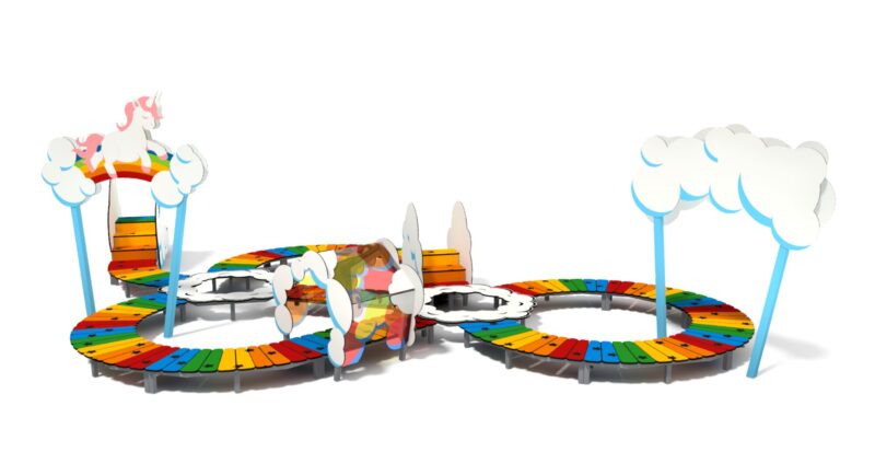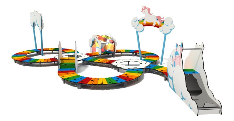 Urządzenie w formie ścieżki do nauki utrzymywania równowagi, składające się z platform w kolorach tęczy, ułożonych po łukach przeplatanych urzadzeniami dodatkowymi, takimi jak portale, tunele, schody i zjeżdżalnie. Platformy wykonane z różnokolorowego HDPE wspartego na stalowym stelażu, tunel z poliweglanu z transparentnym nadrukiem UV, aplikacje pionowe chumu wykonane z HPL z nadrukiem UV.