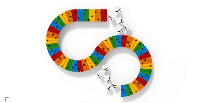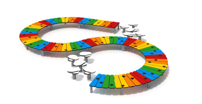 Urządzenie w formie ścieżki do nauki utrzymywania równowagi, składające się z platform w kolorach tęczy, ułożonych po łukach. Platformy wykonane z różnokolorowego HDPE wspartego na stalowym stelażu.