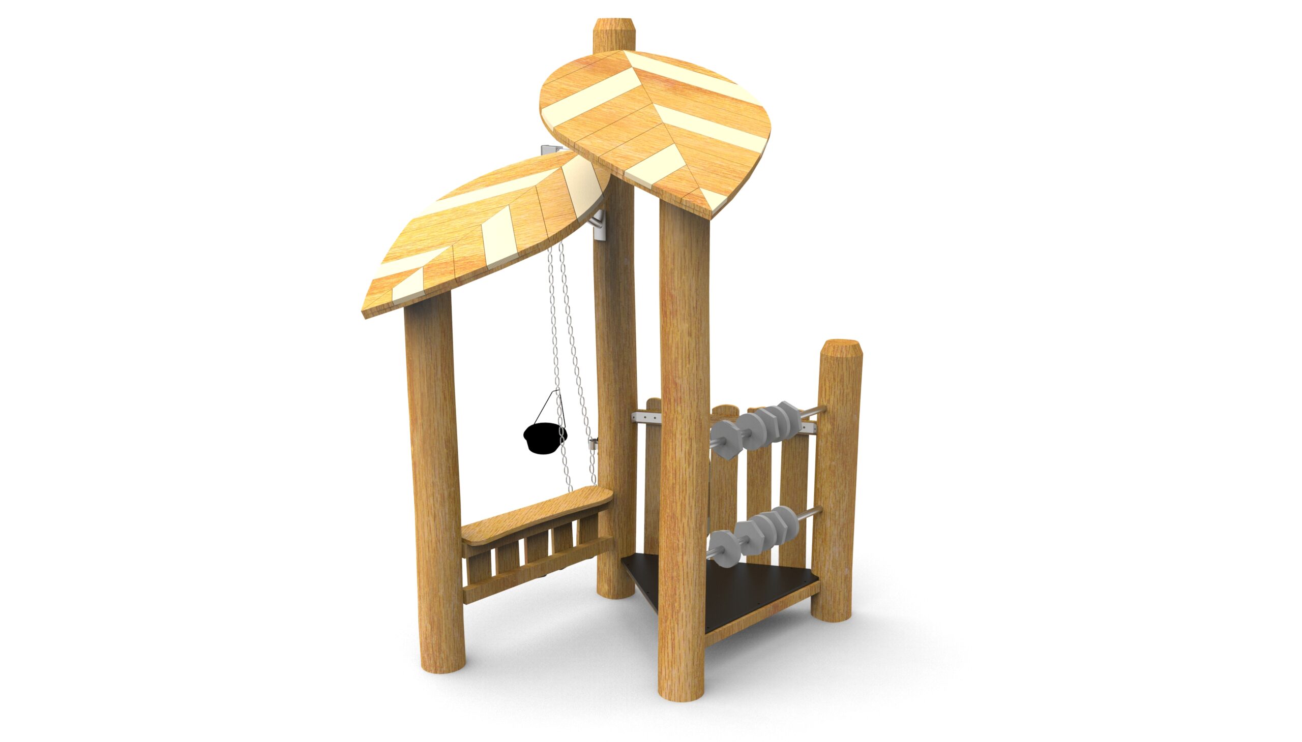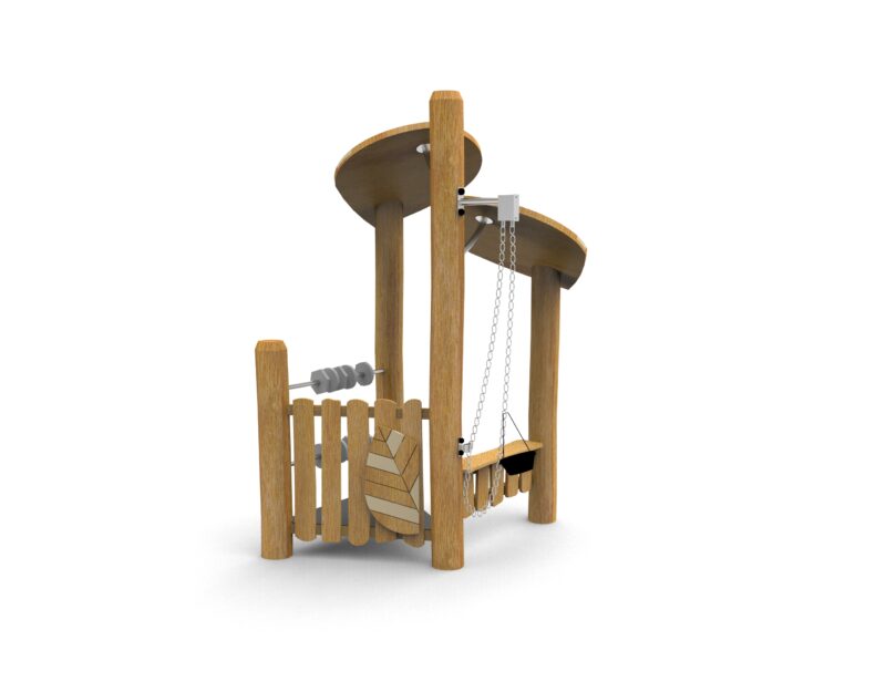 Urządzenie z bali z akcji robioniowej. Podesty pokryte powłoką antypoślizgową. Zjeżdżalnie ze stali nierdzewnej.