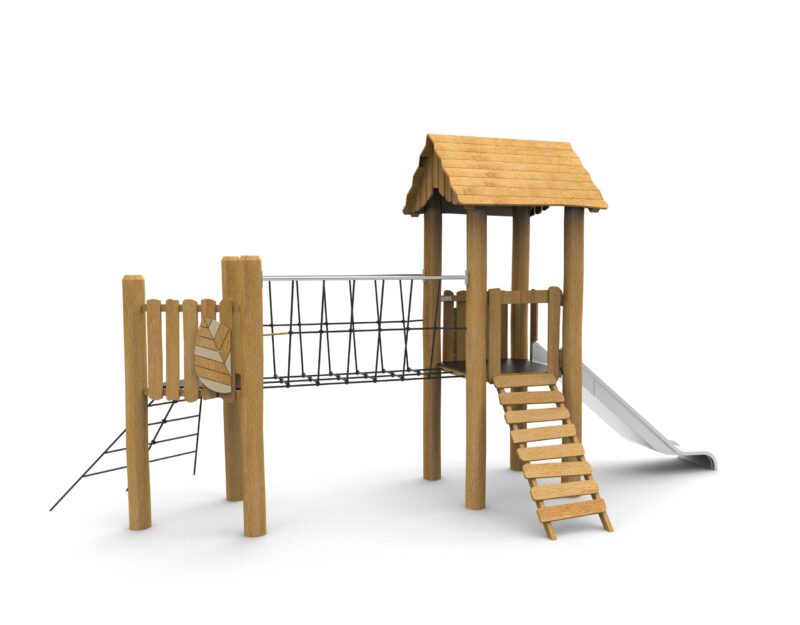 Urządzenie z bali z akcji robioniowej. Podesty pokryte powłoką antypoślizgową. Zjeżdżalnie ze stali nierdzewnej.