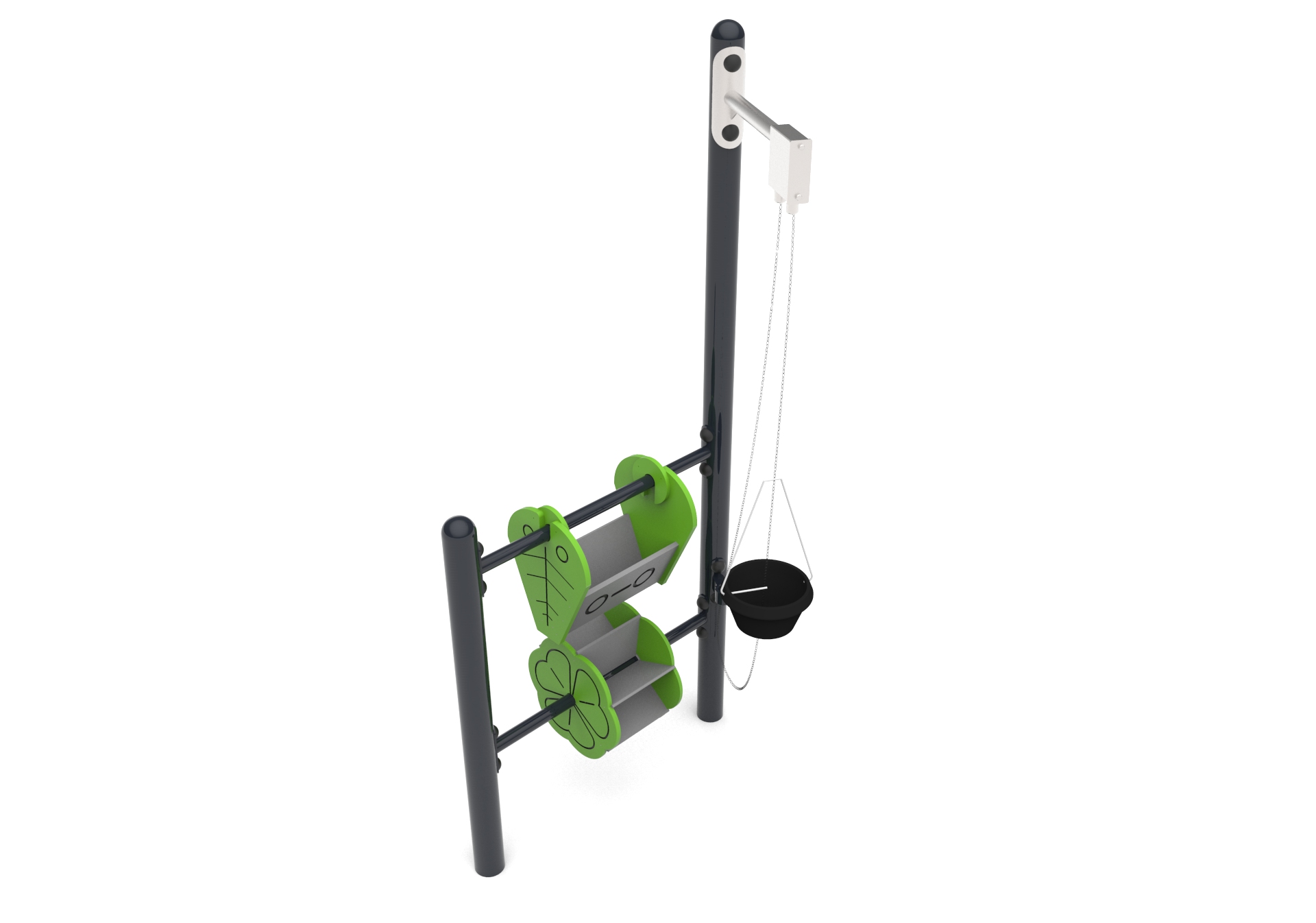 Urządzenie na słupach stalowych okrągłych. Wiaderka wykonane z gumy, ślizgi wykonane z rur ze stali nierdzewnej. Blaty wsparte na spawanej ramie z profili stalowych. Słupy zakończone sferycznymi zaślepkami z gumy.