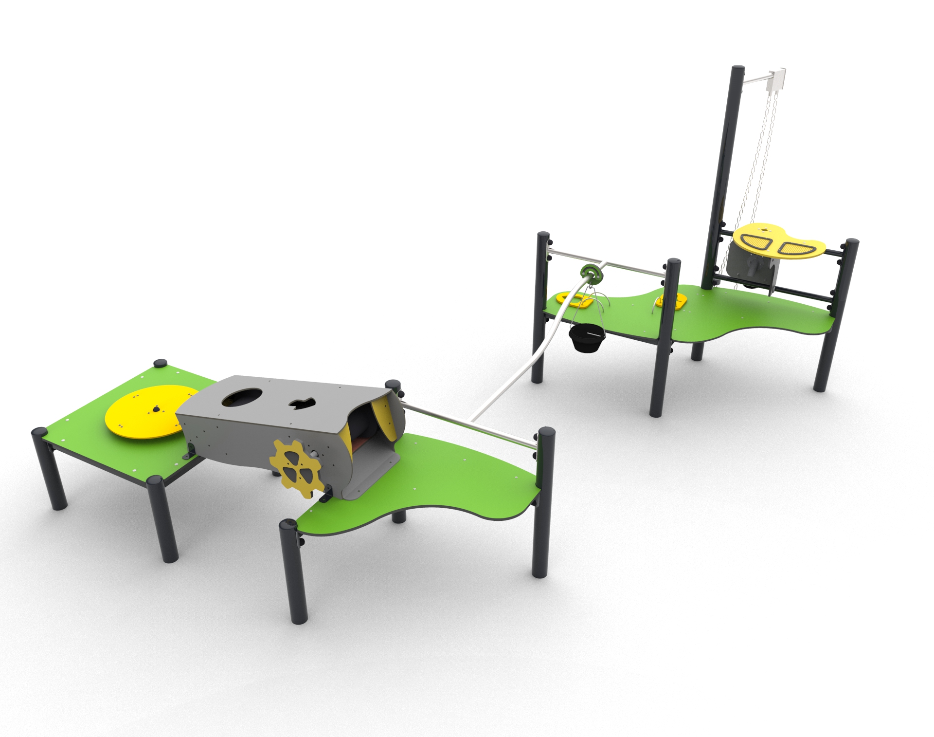 Urządzenie na słupach stalowych okrągłych. Wiaderka wykonane z gumy, ślizgi wykonane z rur ze stali nierdzewnej. Blaty wsparte na spawanej ramie z profili stalowych. Słupy zakończone sferycznymi zaślepkami z gumy.