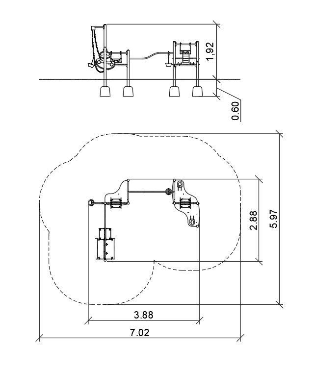 Urządzenie na słupach stalowych okrągłych. Wiaderka wykonane z gumy, ślizgi wykonane z rur ze stali nierdzewnej. Blaty wsparte na spawanej ramie z profili stalowych. Słupy zakończone sferycznymi zaślepkami z gumy.