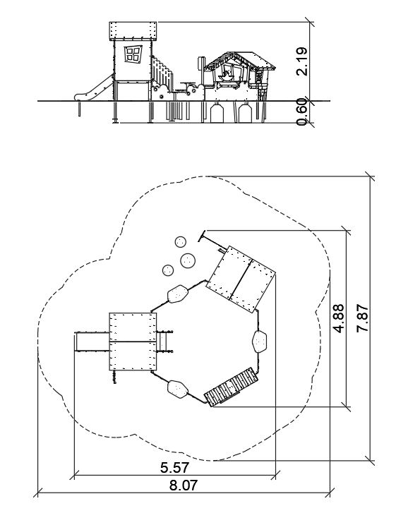 Modułowa piaskownica składająca się z 3 obrzeży z blatami, kramu, kawiarenki i stacji przybrzeżnej. Kram to urządzenie w kształcie kramu z dwuspadowym dachem w paski, wyposażone w wagę, dwie skośne półki sklepowe i ladę. Kawiarenka to domek o pochyłych ścianach i dwuspadowym dachu. We wnętrzu znajduje się nierdzewny zlew i piekarnik oraz imitacja kranu pozwalająca na zabawę w kawiarenkę. Całość uzupełnia okno ladowe, stolik z dwoma siedziskami, szyld i znak drogowy. Stacja przybrzeżna to domek z pochyłymi ścianami, dwuspadowym dachem, schodami, zjeżdżalnią i płotkiem z imitacją koła ratunkowego.