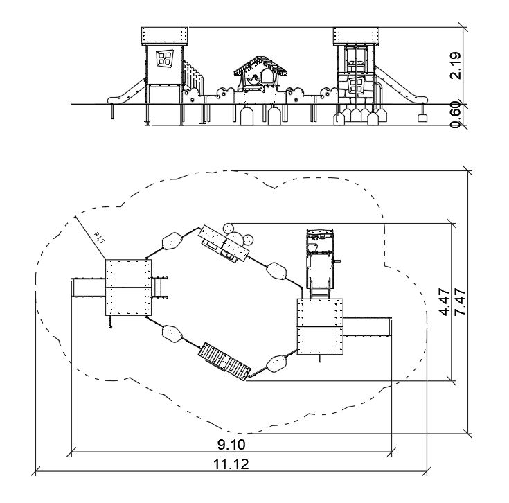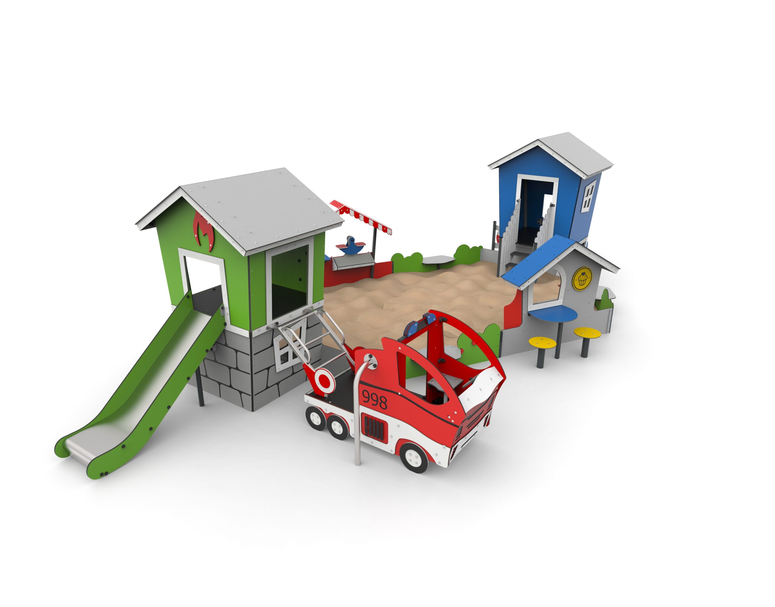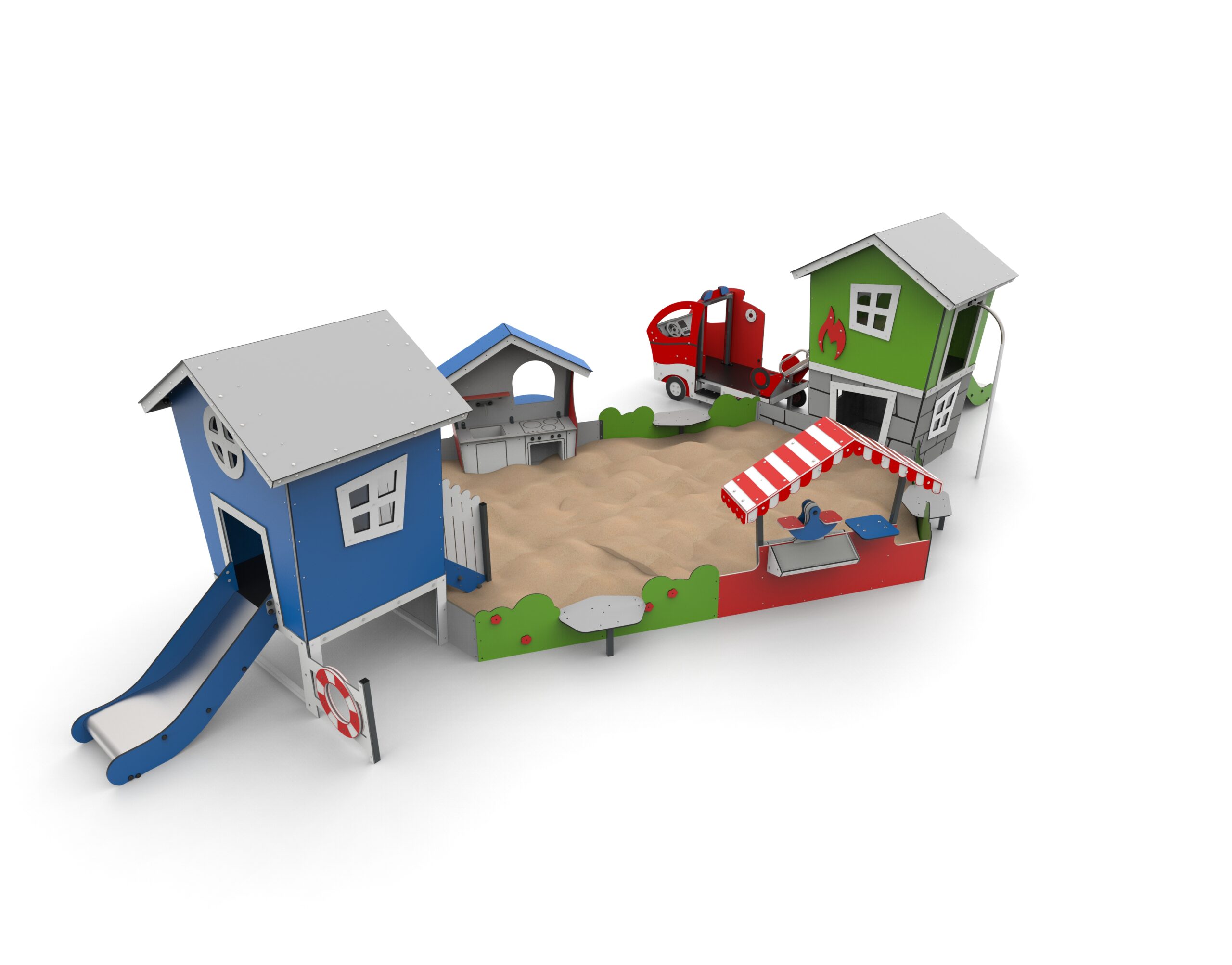 Modułowa piaskownica składająca się z 4 obrzeży z blatami, kramu, lodziarni, stacji przybrzeżnej i remizy strażackiej. Kram to urządzenie w kształcie kramu z dwuspadowym dachem w paski, wyposażone w wagę, dwie skośne półki sklepowe i ladę. Lodziarnia to urządzenie w postaci jednej ściany z dwuspadowym dachem, nierdzewnym piekarnikiem i zlewem, imitacją kranu i płyty grzewczej, okienkiem z ladą i dwoma siedziskami. Stacja przybrzeżna to domek z pochyłymi ścianami, dwuspadowym dachem, schodami, zjeżdżalnią i płotkiem z imitacją koła ratunkowego. Remiza strażacka to urządzenie w kształcie dwupoziomowego domku z pochyłymi ścianami i dwuspadowym dachem i wozem strażackim połączonych ze sobą drabiną. Dom wyposażony w aplikacje płomieni, zjeżdżalnię, rurę strażacką i telefon akustyczny łączący go z wozem strażackim. Wóz posiada obrotową kierownicę siedzisko i numery alarmowe.