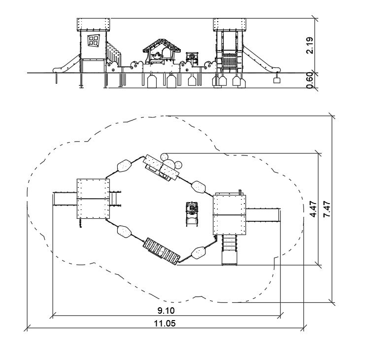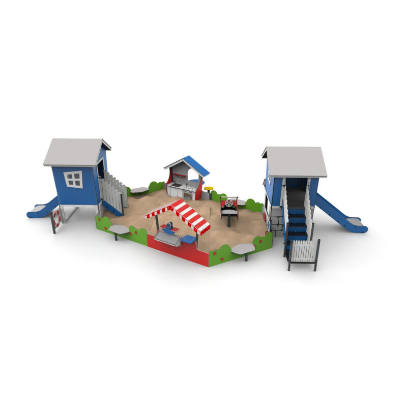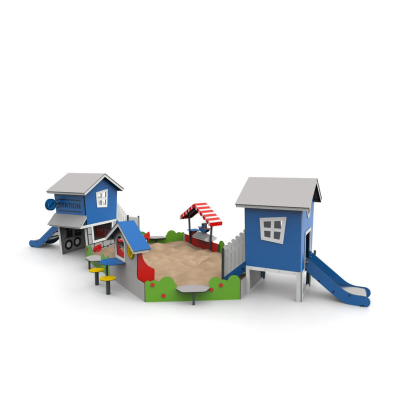 Modułowa piaskownica składająca się z 4 obrzeży z blatami, kramu, lodziarni, stacji przybrzeżnej i warsztatu. Kram to urządzenie w kształcie kramu z dwuspadowym dachem w paski, wyposażone w wagę, dwie skośne półki sklepowe i ladę. Lodziarnia to urządzenie w postaci jednej ściany z dwuspadowym dachem, nierdzewnym piekarnikiem i zlewem, imitacją kranu i płyty grzewczej, okienkiem z ladą i dwoma siedziskami. Stacja przybrzeżna to domek z pochyłymi ścianami, dwuspadowym dachem, schodami, zjeżdżalnią i płotkiem z imitacją koła ratunkowego. Warsztat to urządzenie w kształcie dwupoziomowego domku z pochyłymi ścianami i dwuspadowym dachem, wyposażone w schody, zjeżdżalnię, imitację narzędzi, kół zapasowych, z samochodem na podnośniku z imitacją silnika, z obrotową kierownicą, agregatora z klemami i wolnostojącego dystrybutora paliwa z wężem w formie liny do tankowania samochodu.