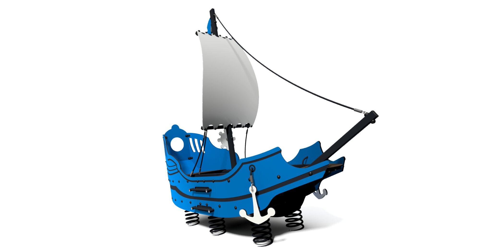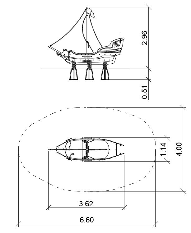 Urządzenie w formie statku posadowione na 6 sprężynach, z burtami i żaglem z giętego HDPE. Dodatkowo posiadające wciągane kotwice, koło sterowe i olinowanie masztu. Na burtach po obu stronach drążki ułatwiające wejście na pokład.