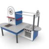 Urządzenie do zabawy w błotną kuchnię, posiada kran z możliwością przyłącza węża ogrodowego, dodatkowo wyposażone jest w dwa piekarniki wykonane ze stali nierdzewnej i zlew z możliwością podłożenia wiadra pod spodem. Na blacie znajduje się frez imitujący płytę grzewczą i 8 pokręteł. Ponad blatem znajdują się 2 drążki do wieszania akcesoriów, obrotowa tarcza zegara do nauki godzin i 2 półki.