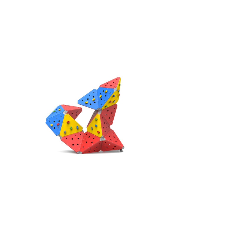 Urządzenie wspinaczkowe składające się z trójkątnych płyt z HPL, ułożonych pod różnymi kątami, wzmocnionych od środka stalową ramą.