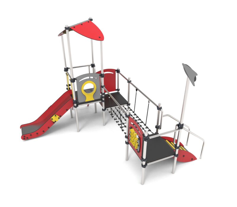 Urządzenie na słupach okrągłych z obejmami aluminiowymi. Podesty pokryte powłoką antypoślizgową wsparte na spawanej ramie stalowej.