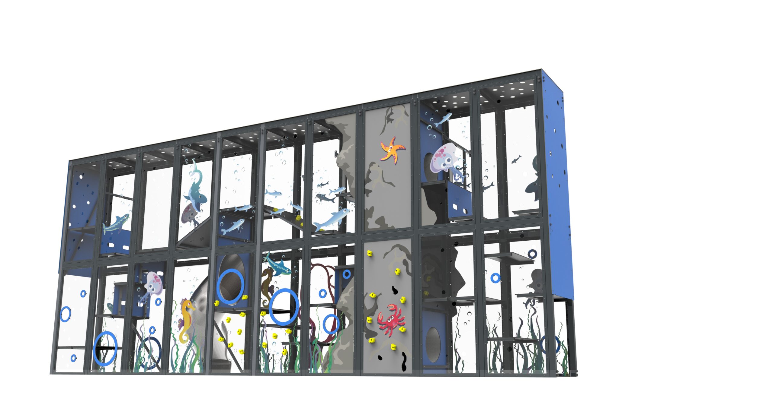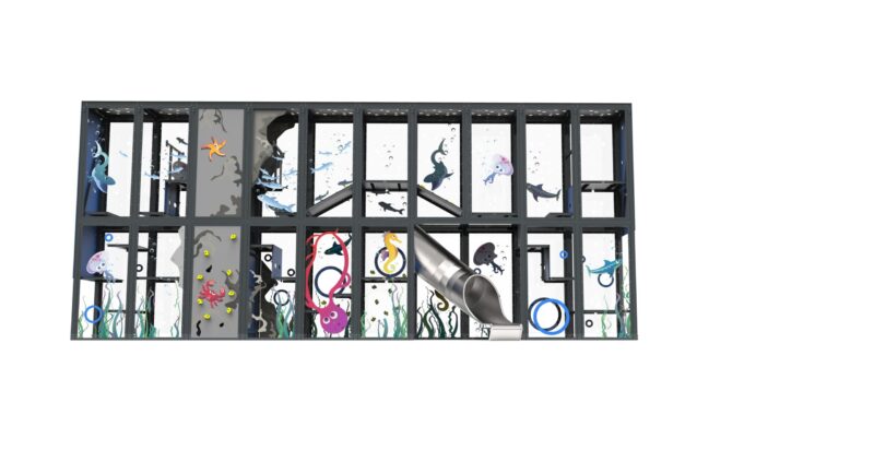 Urządzenie w formie pionowego labiryntu zbudowanego z podestów, przejść tunelowych i trapów. Dłuższe ściany wykonane z płyt poliweglanowych, z nadrukami UV, w ramach stalowych umożliwiających łatwą wymianę w razie wandalizmu.